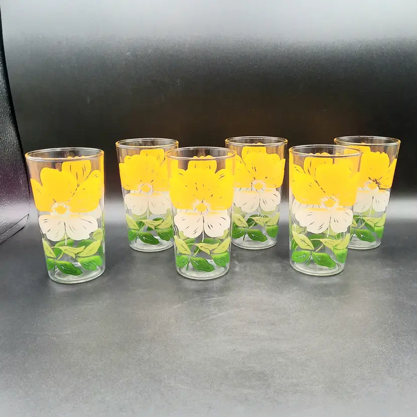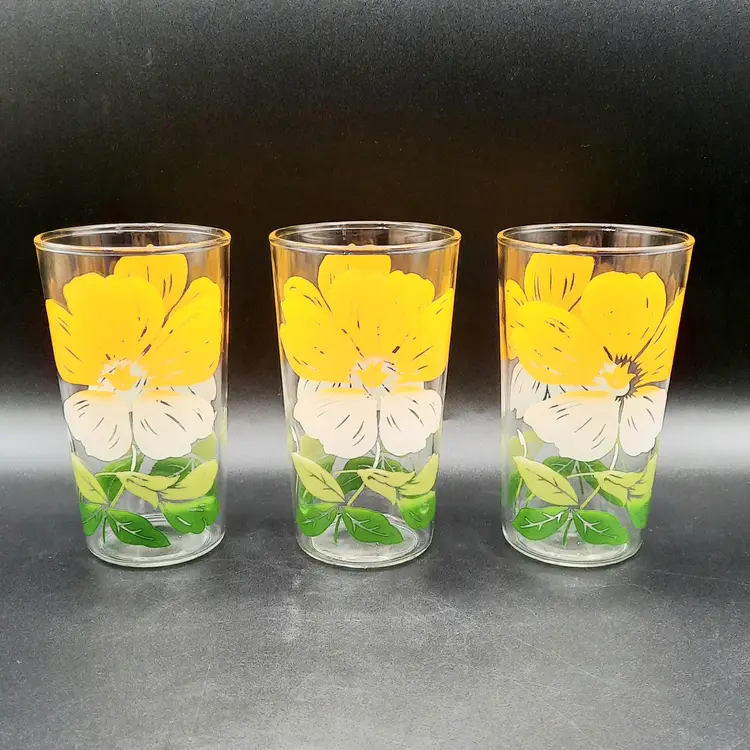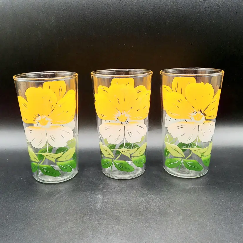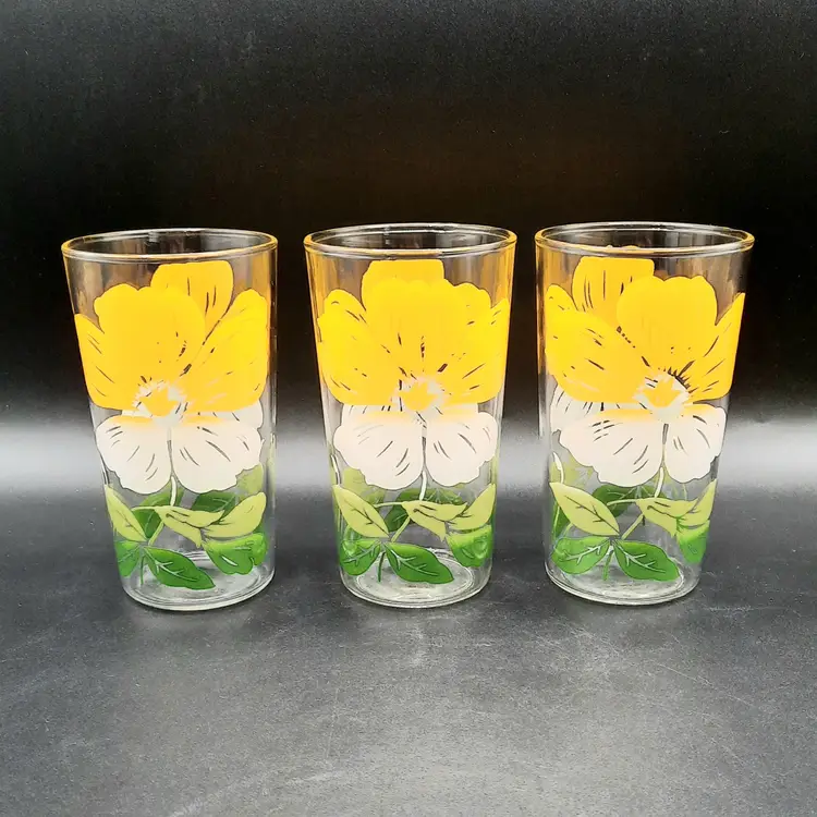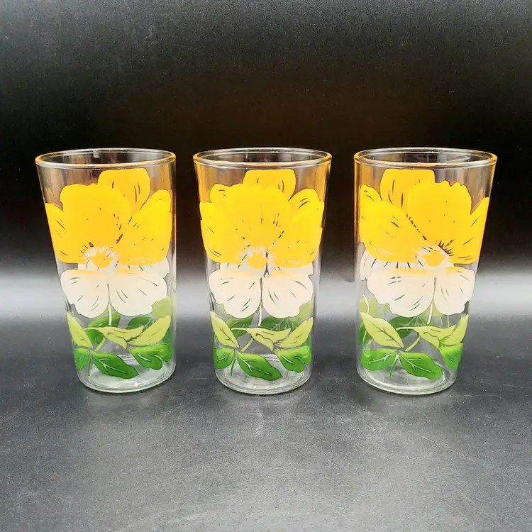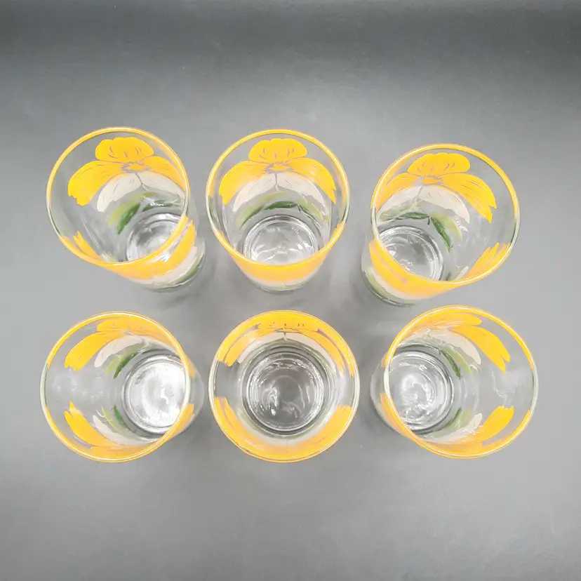 These fun retro glasses are such a vibrant yellow! 4 1/2"H x 2 1/2"W at rim, excellent condition with some discoloration/staining on upper part of yellow on 2 of the glasses