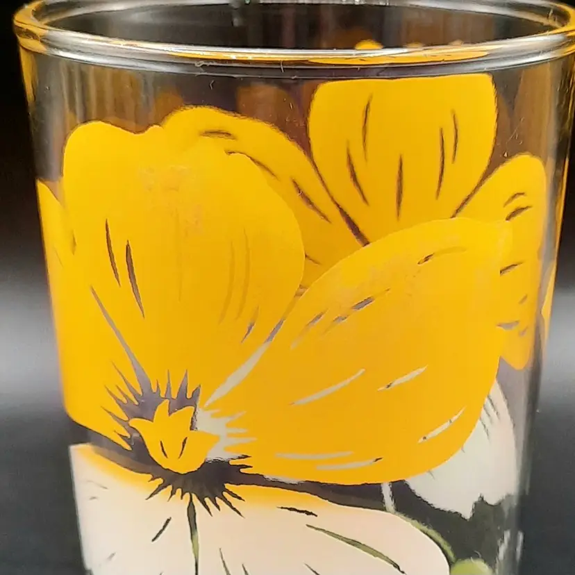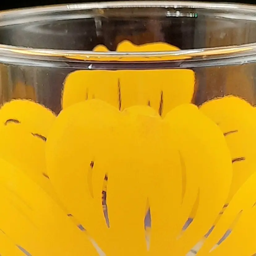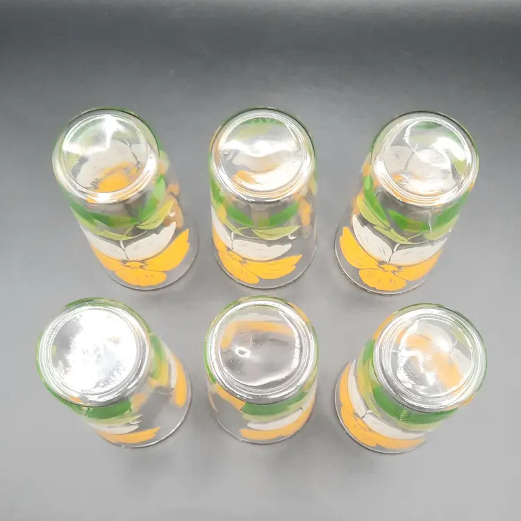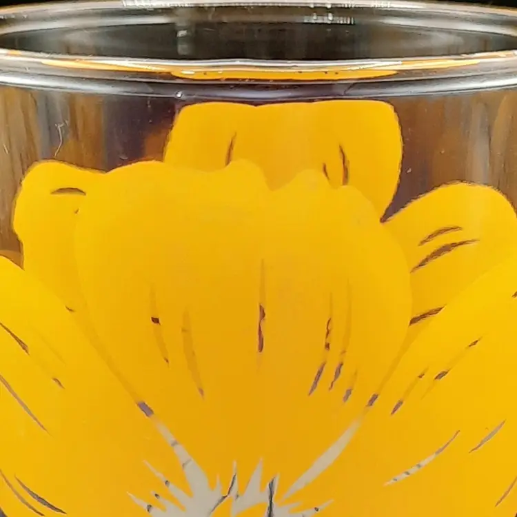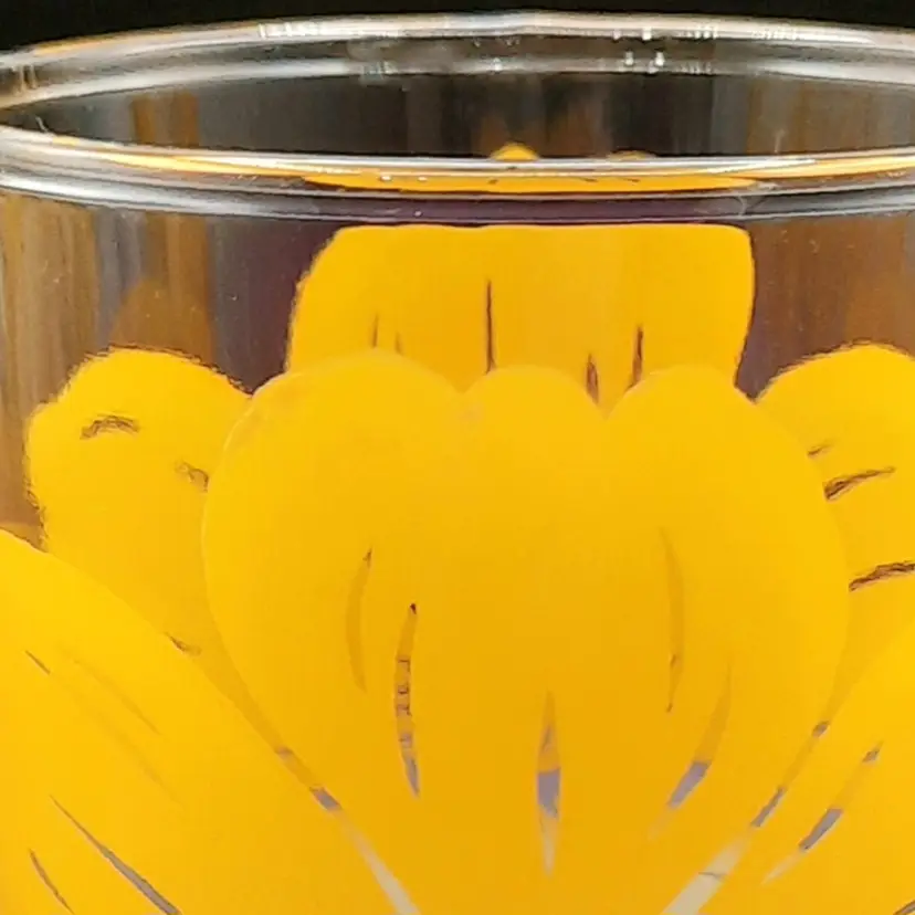 These fun retro glasses are such a vibrant yellow! 4 1/2"H x 2 1/2"W at rim, excellent condition with some discoloration/staining on upper part of yellow on 2 of the glasses