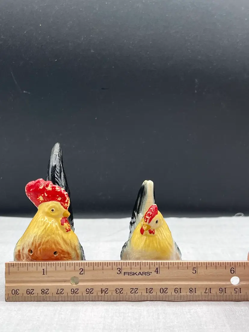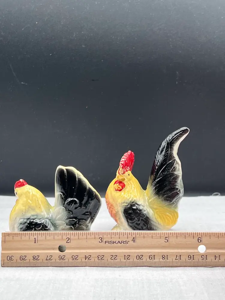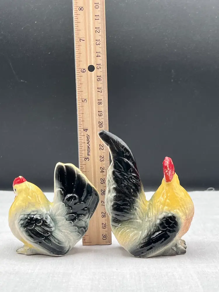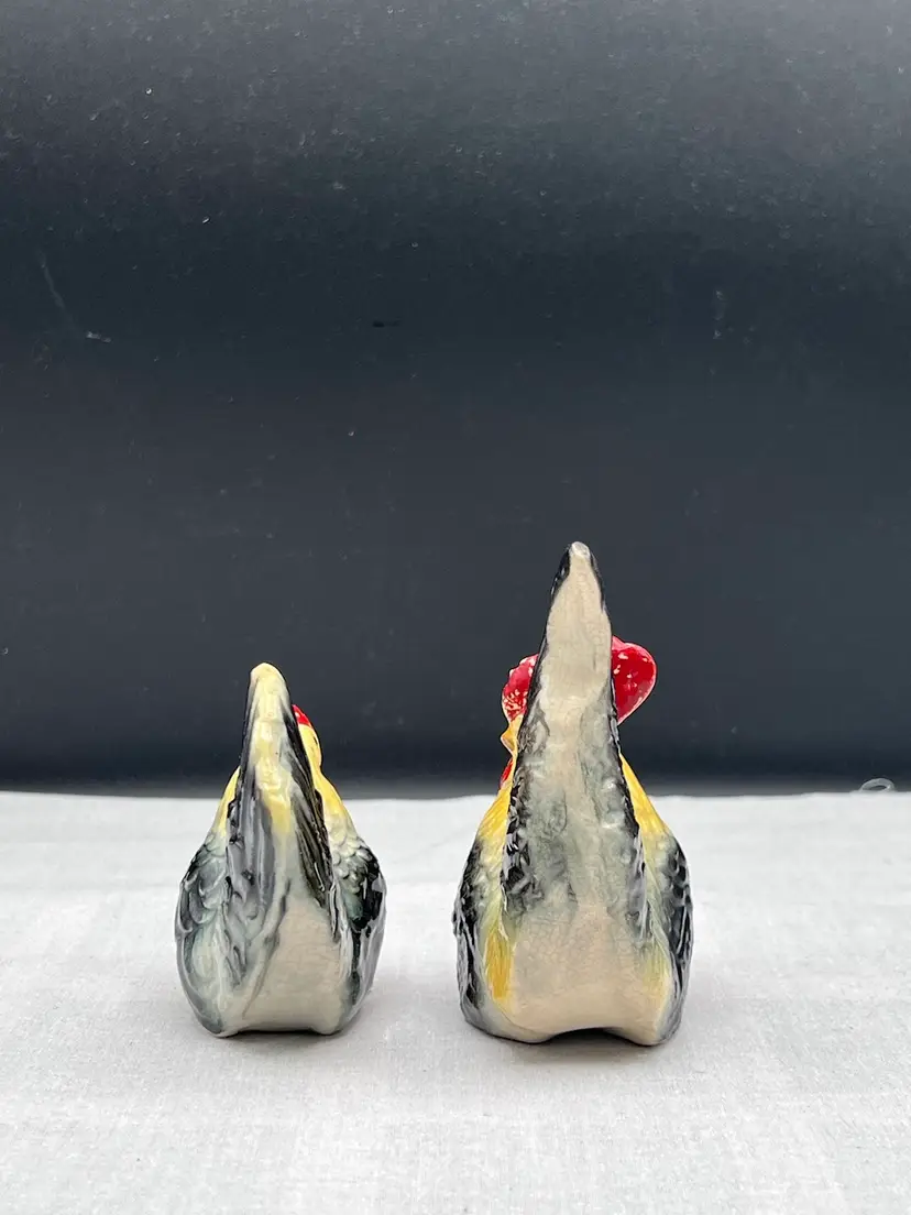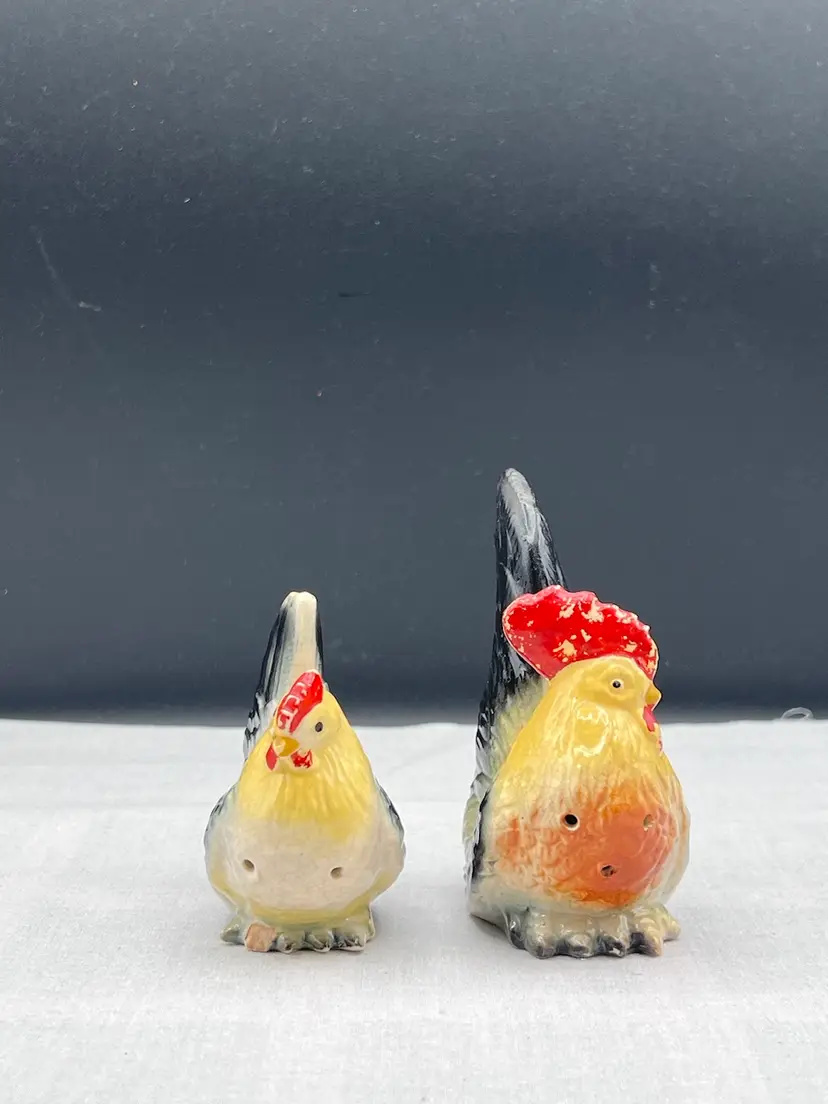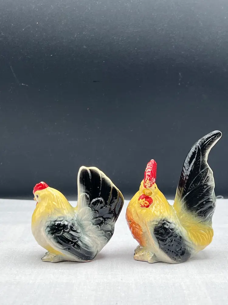 Beautiful vintage rooster and hen salt & pepper shaker set in black, yellow and white In good vintage condition no chips or cracks, several spots of paint wear and they are starting to craze due to age. See pics for details. Rooster is 4" x 2 3/4" and the hen is 3" x 3" Rooster has original cork, hen does not No makers mark