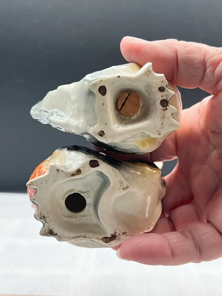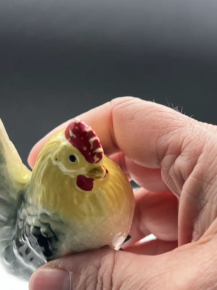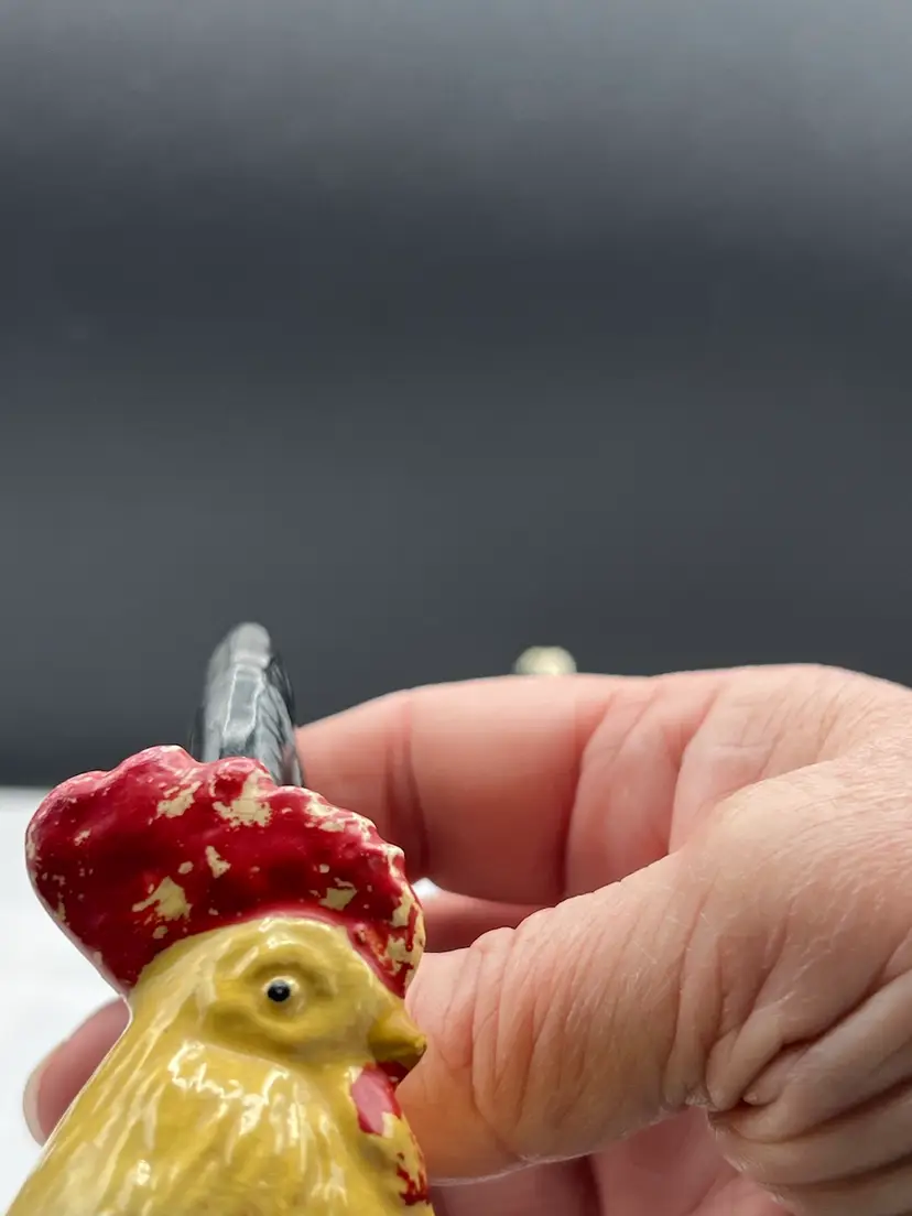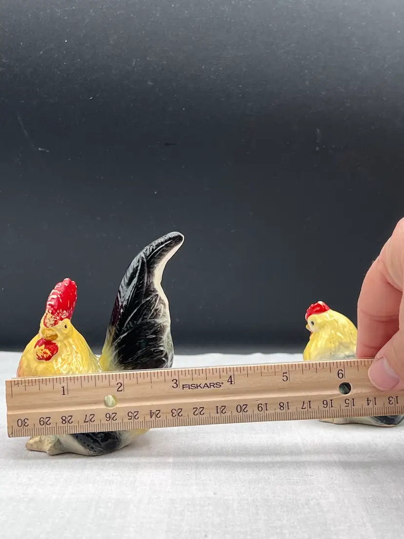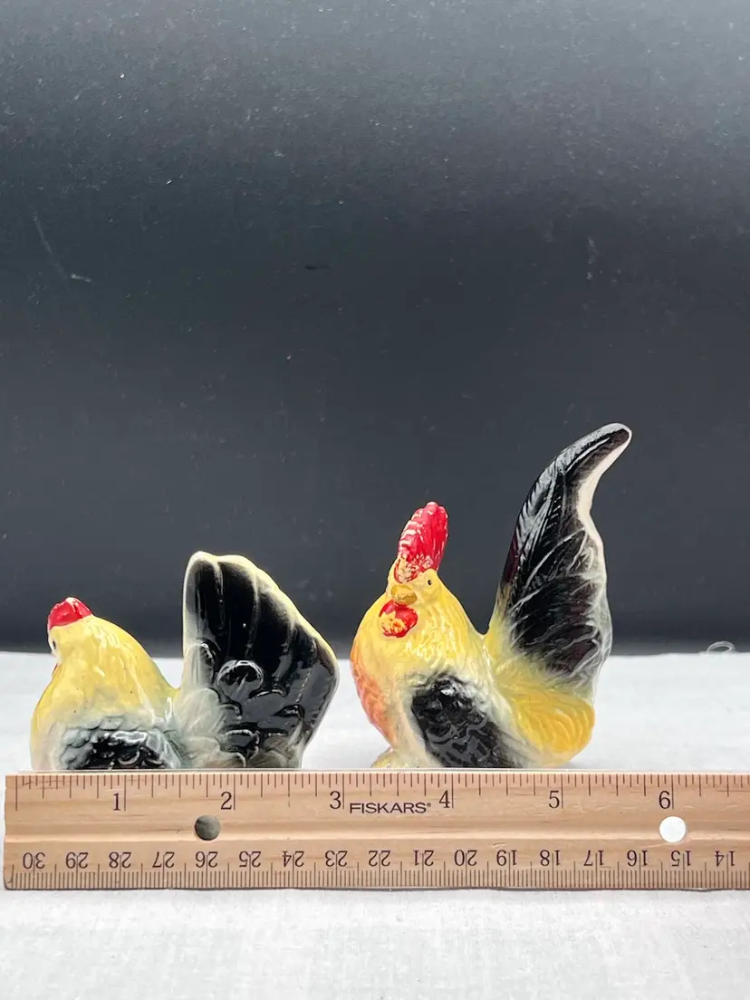 Beautiful vintage rooster and hen salt & pepper shaker set in black, yellow and white In good vintage condition no chips or cracks, several spots of paint wear and they are starting to craze due to age. See pics for details. Rooster is 4" x 2 3/4" and the hen is 3" x 3" Rooster has original cork, hen does not No makers mark