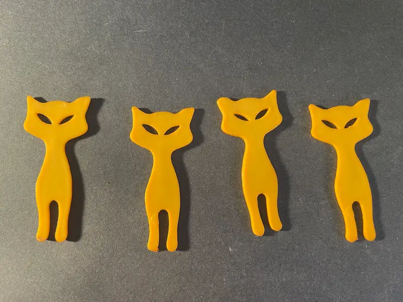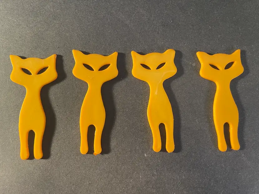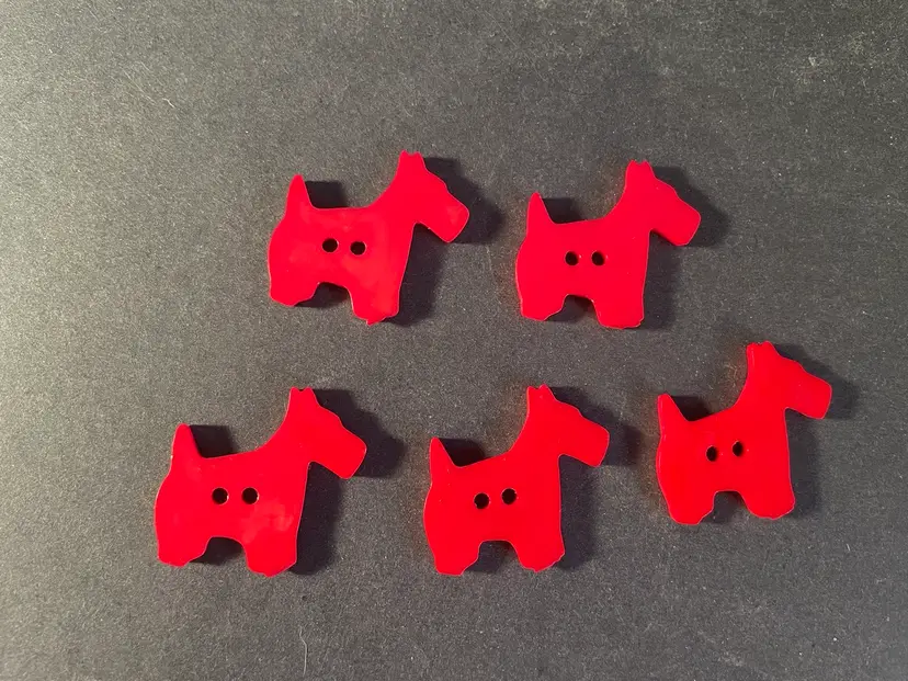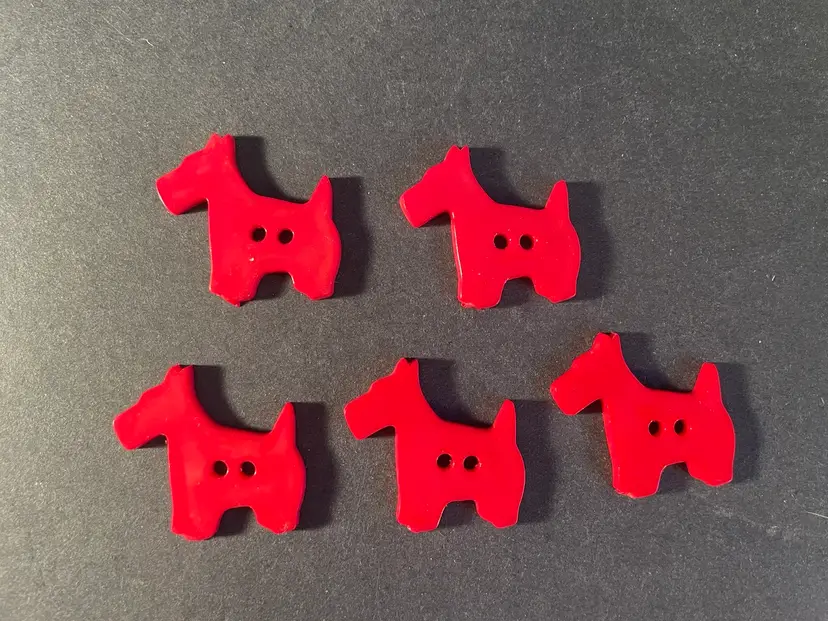 Four yellow stylized cat buttons and 5 red Scotty buttons. They are plastic, I don’t think they are Bakelite. The cats are 2 1/2” tall and 1 3/4” wide. The dogs are 1 1/4” tall and 1 1/2” wide.