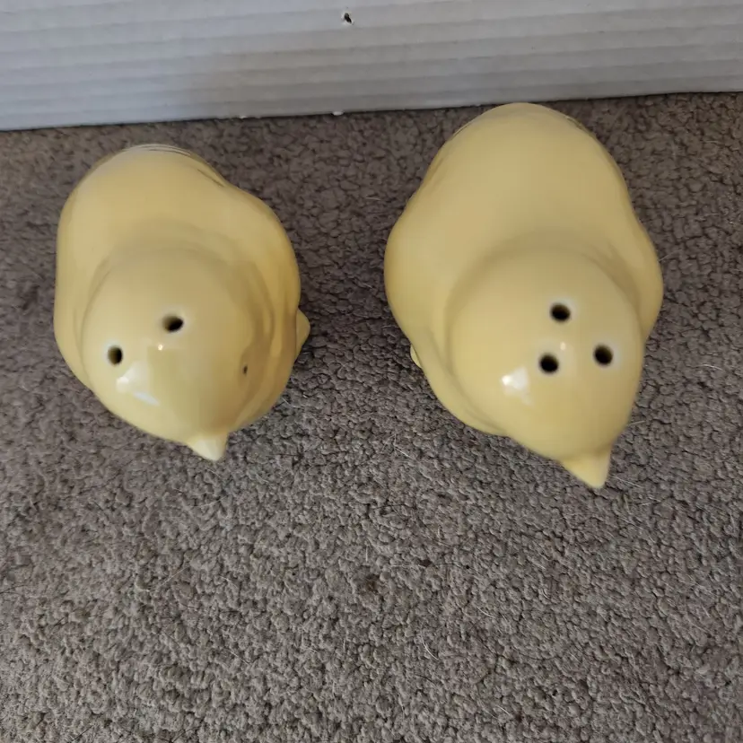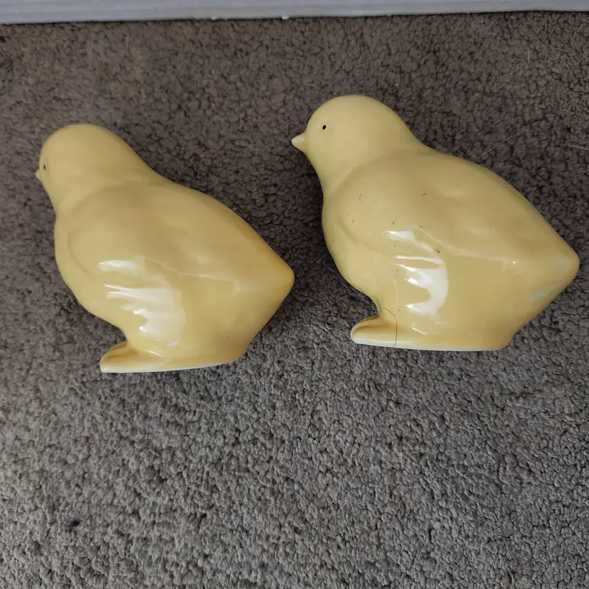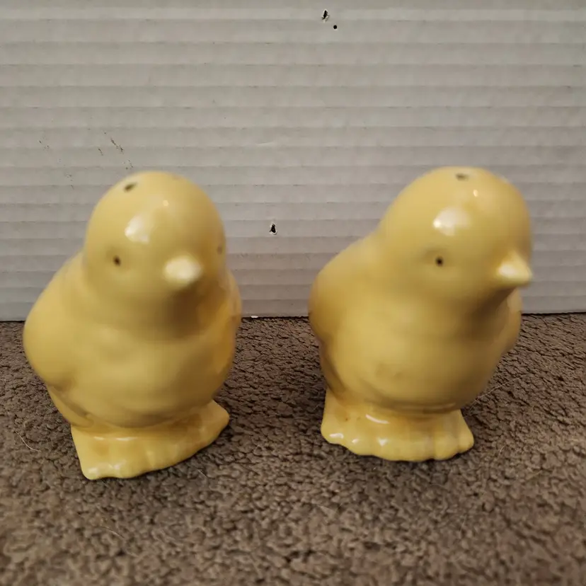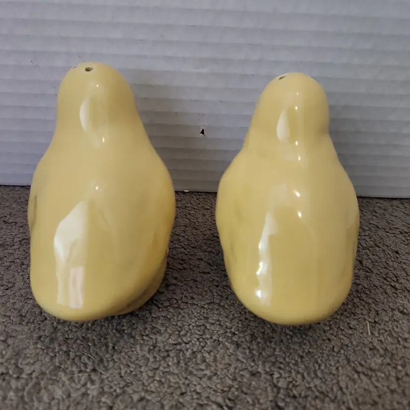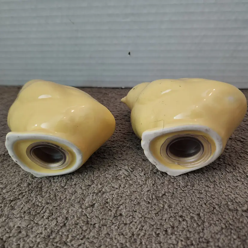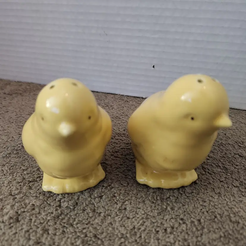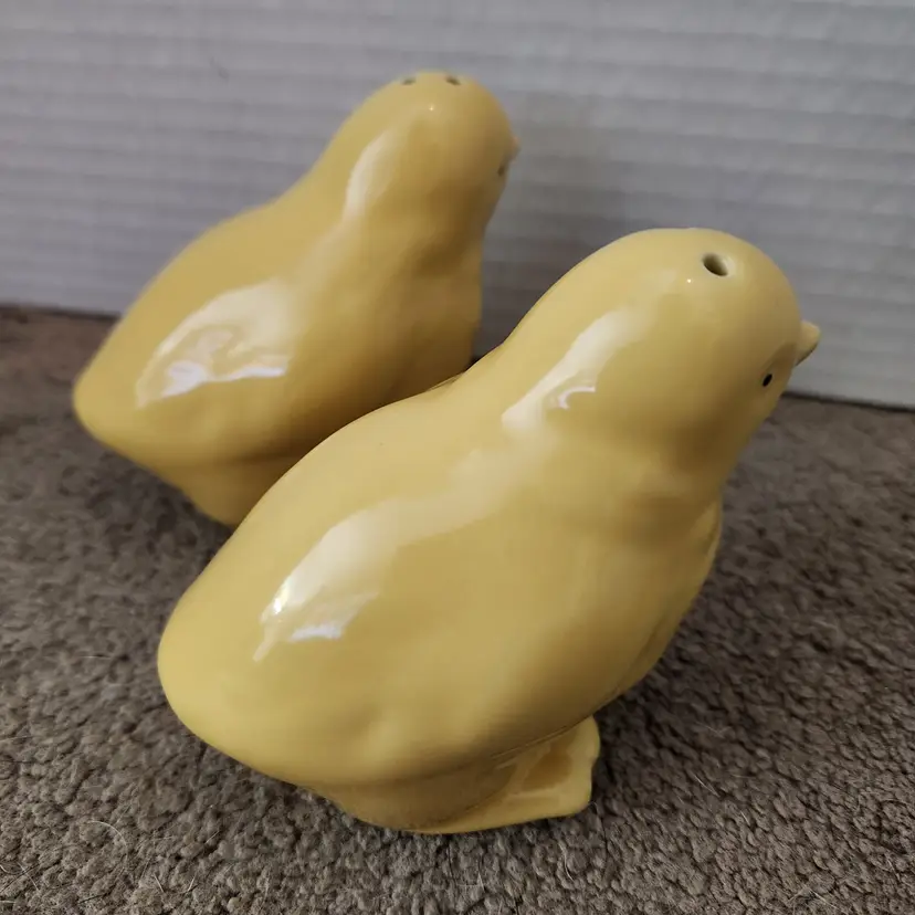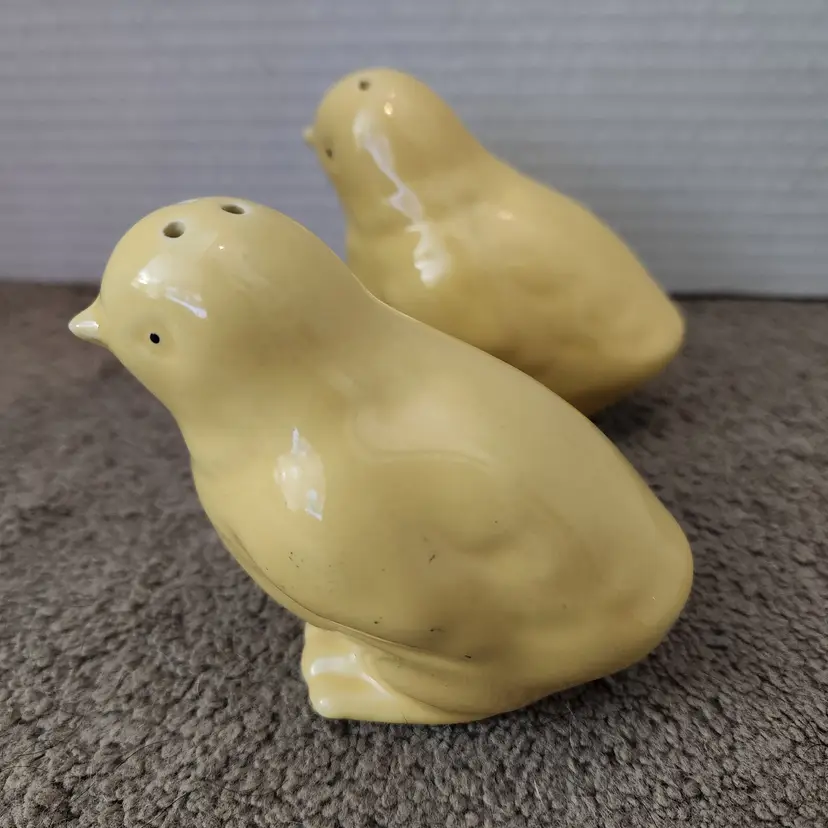 This vintage Easter-themed set includes two small ceramic salt and pepper shakers in the shape of chicks. The yellow color and seasonal theme make them perfect for Easter and spring table decor. Standing at 5 inches tall, these original pieces add a touch of country style to any kitchen or dining setting. The set includes both a pepper shaker and a salt shaker, making it a charming addition to a collection of ceramic kitchen tools and gadgets.
