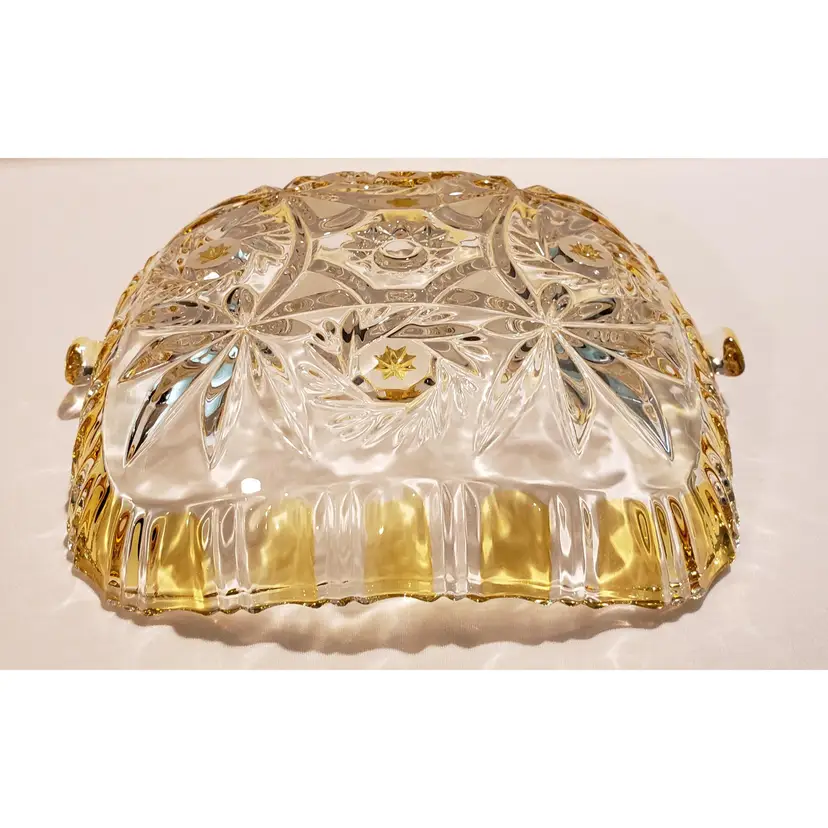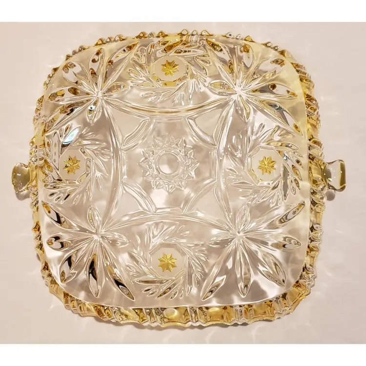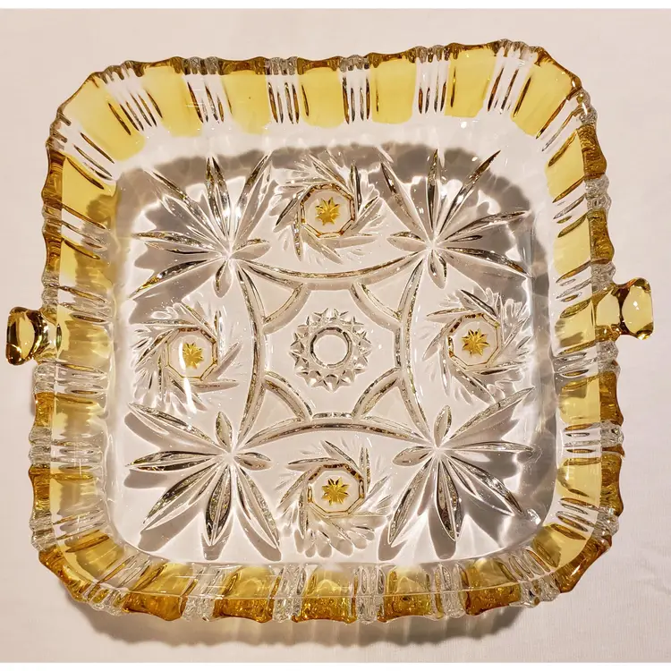 This gorgeous crystal serving dish measures 6 1/2" x 6 1/2" (without the handles). The yellow and clear is accented by some frosted areas. Excellent condition. No chips or cracks.