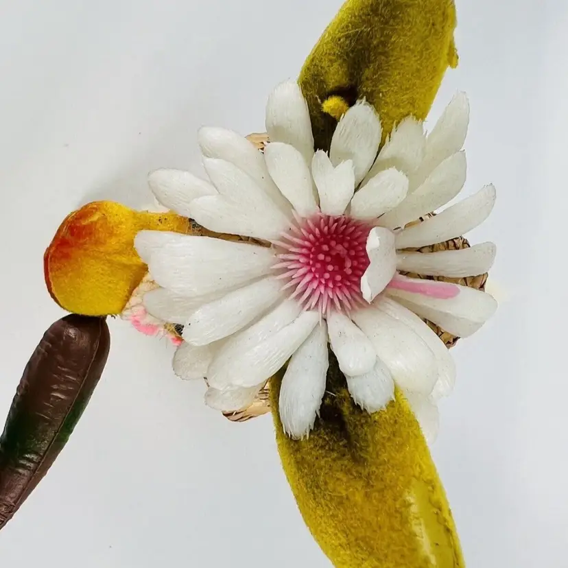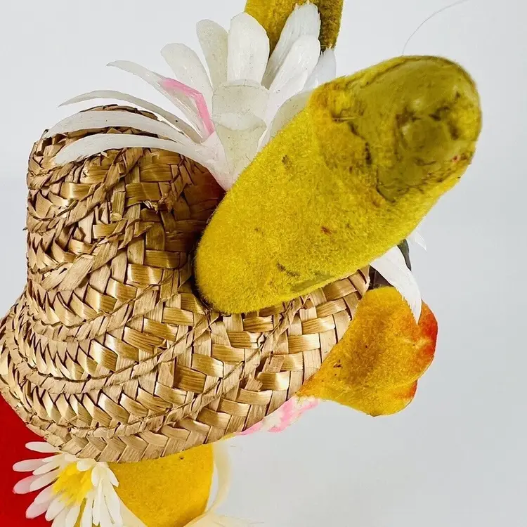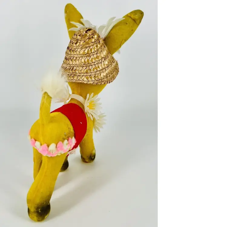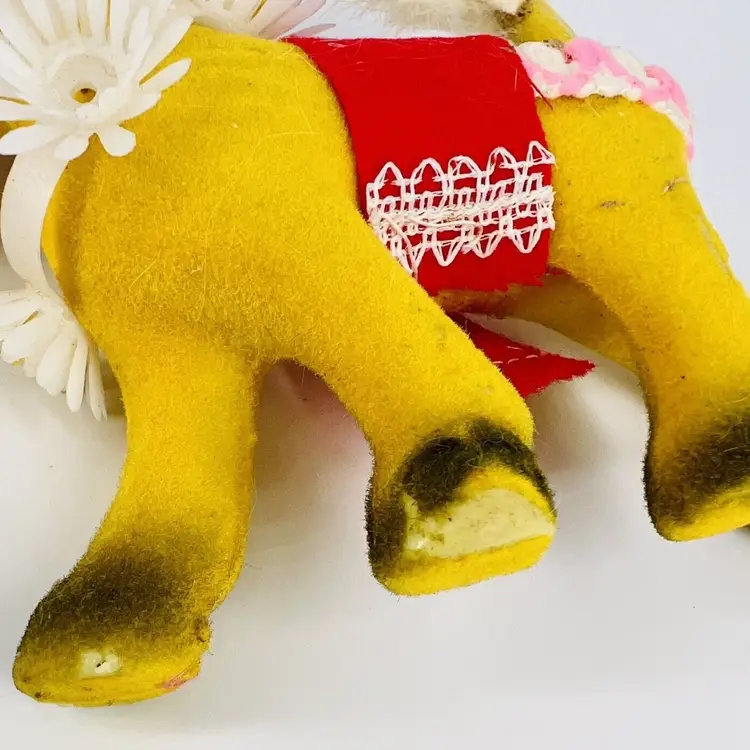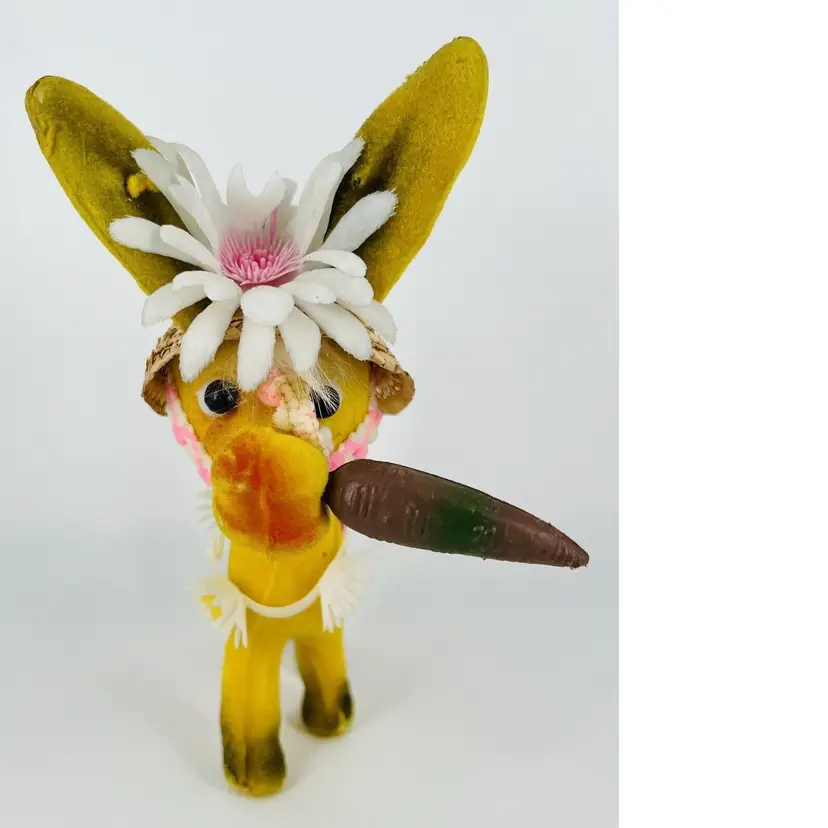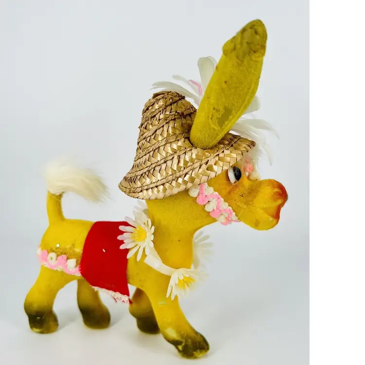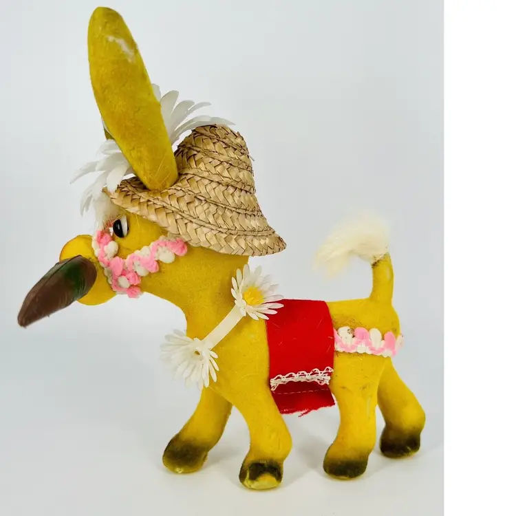 This item is in very good vintage condition. Some missing flocking around ears and a small portion missing on feed. One flower on necklace is missing the center. No holes or stains. See images for details. Measures 6 1/4" tall by 5" long. Weighs 2oz