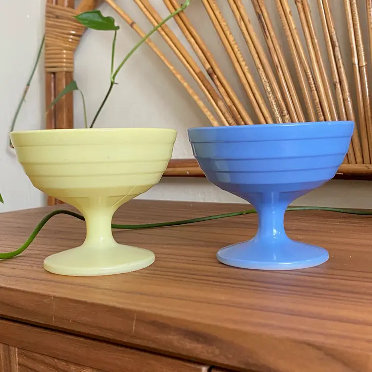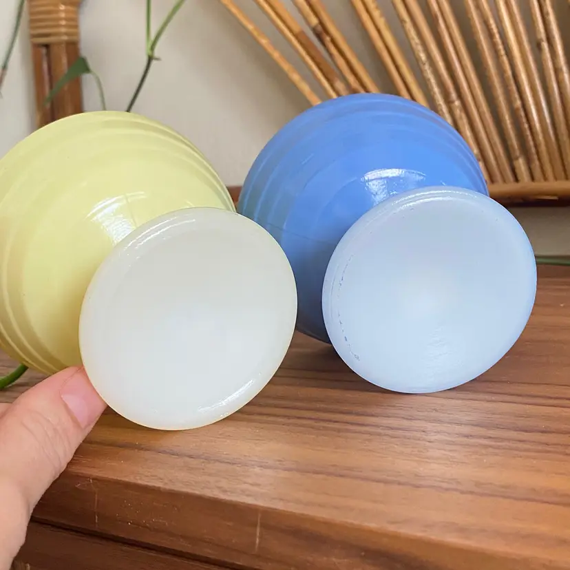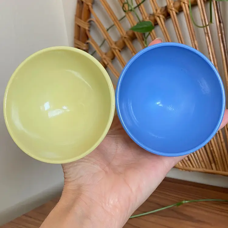 Vintage Hazel Atlas cornflower blue and pale yellow custard coupes. Painted inside as well. Like new! 3-3/8" tall and 3-7/8" diameter.
