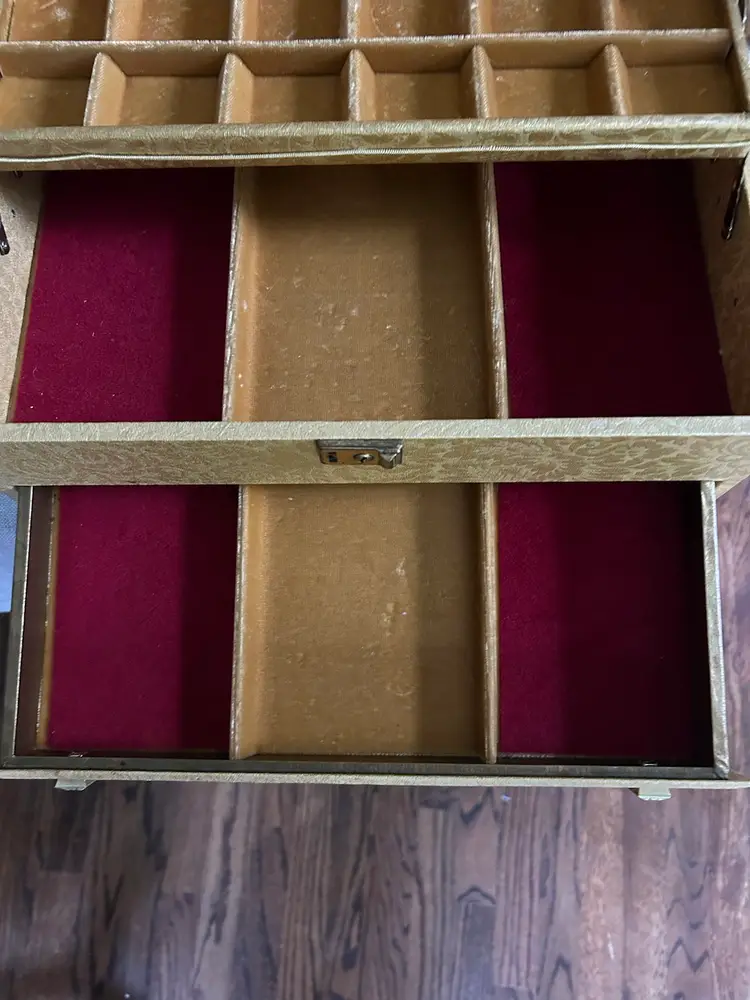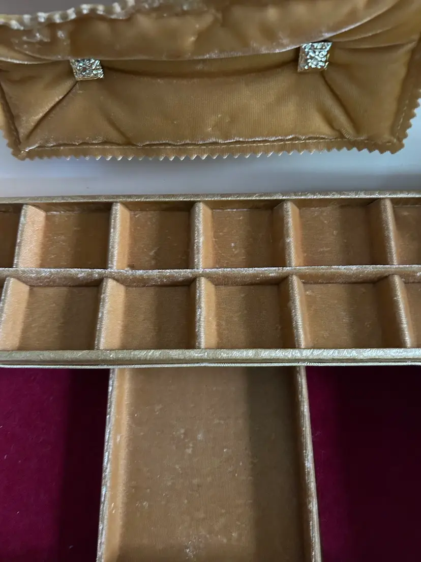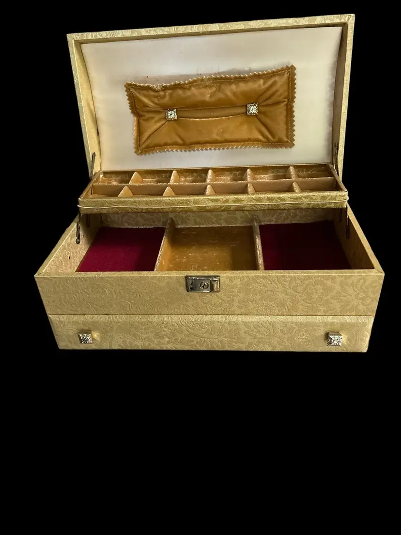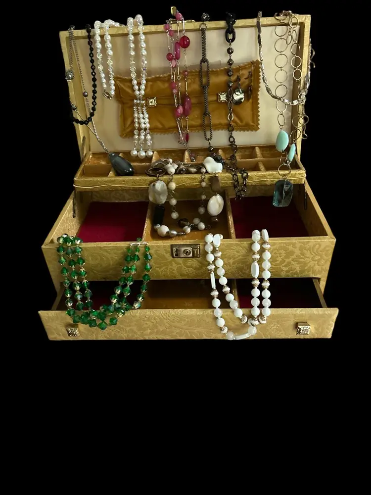 This Yellow Large Vintage Jewelry Box is in great condition. Included is 10 Vintage Necklaces and 1 pair of pierced earrings that match 1 of the necklaces. Please see pictures all jewlery is in very good condition. Jewelry box in good condition as well. Please see pictures for details. Any questions… or need more pics please ask. I am at the max here with the photos. THANK YOU‼️