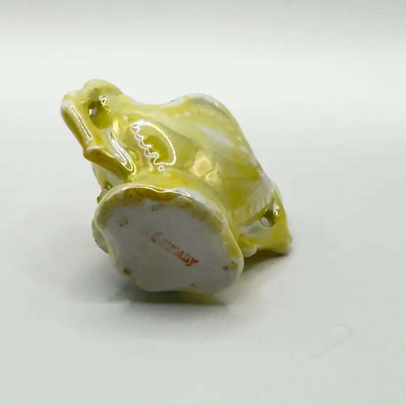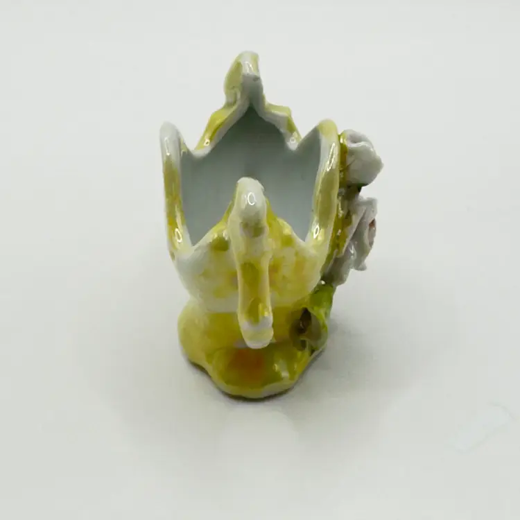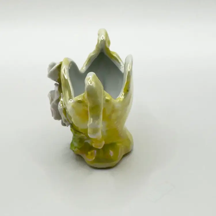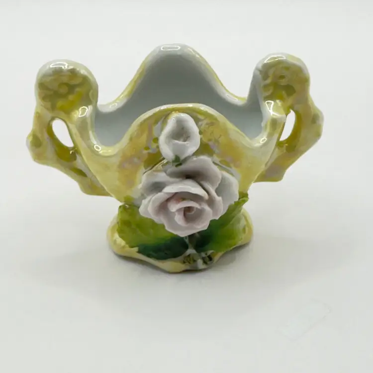 This charming vintage porcelain basket features a delicate rose detail, perfect for adding a touch of elegance to any room. The soft yellow lusterware glaze and intricate floral design make it a lovely decorative piece. Ideal for collectors or as a unique gift. In excellent condition with no visible chips or cracks. Measures 2.5x2x1.5 inches. Weighs 4oz.