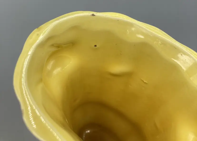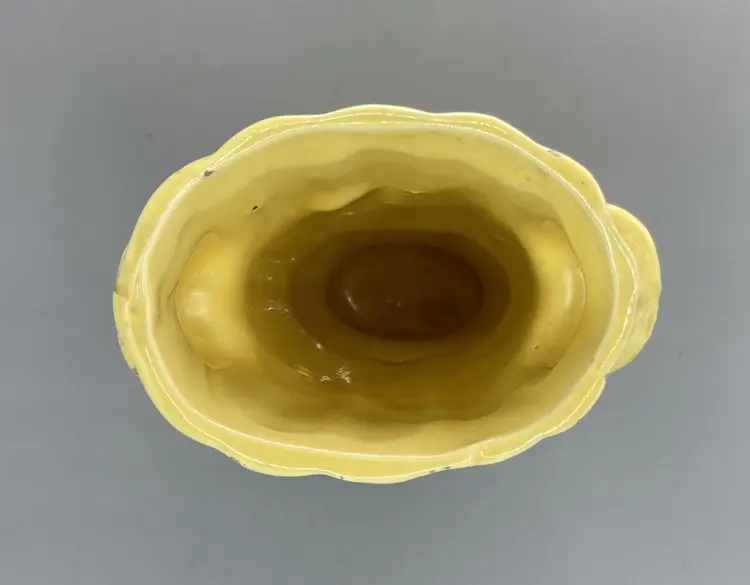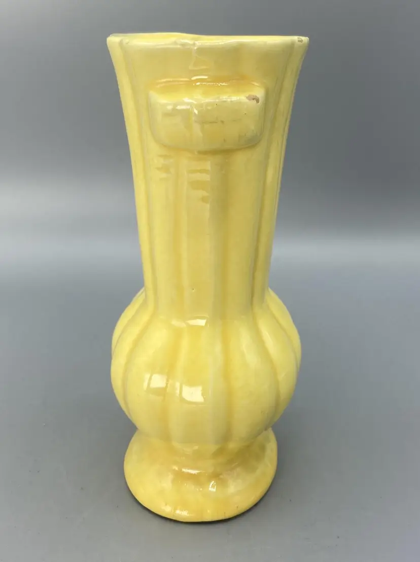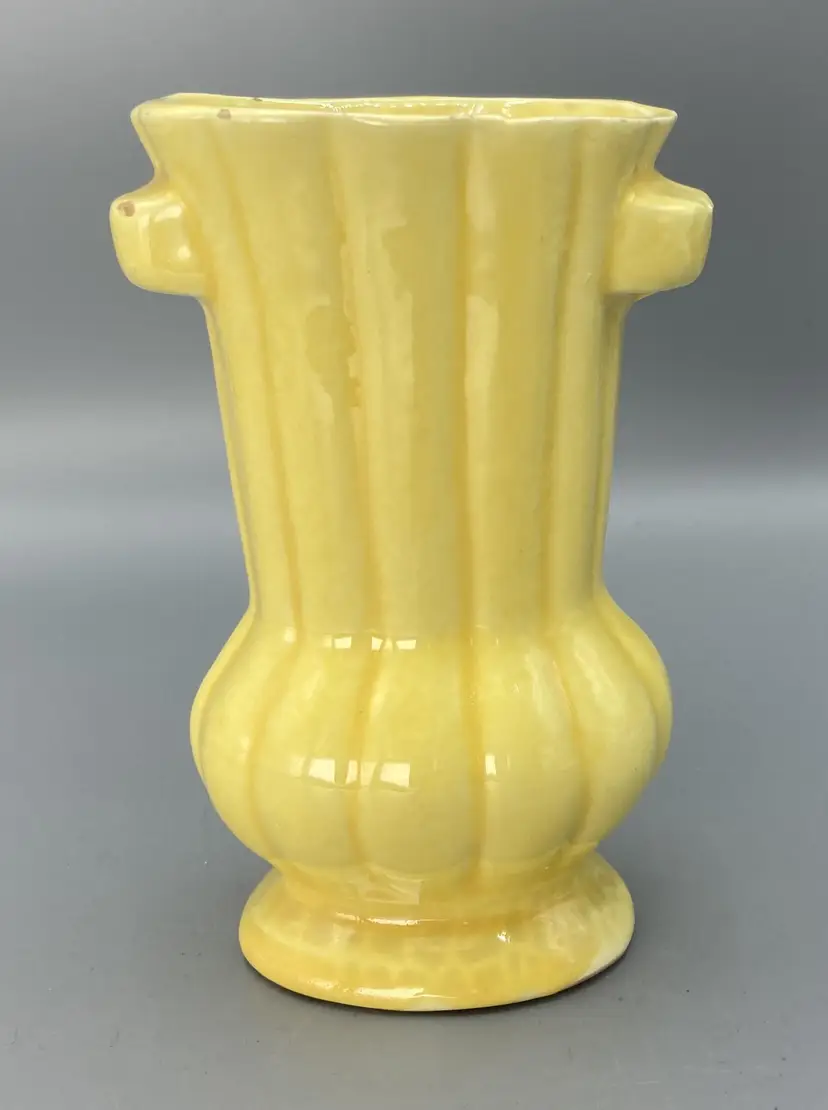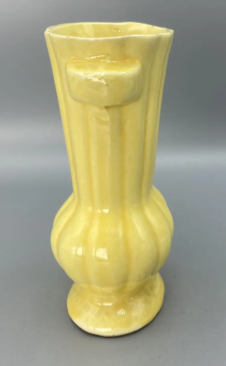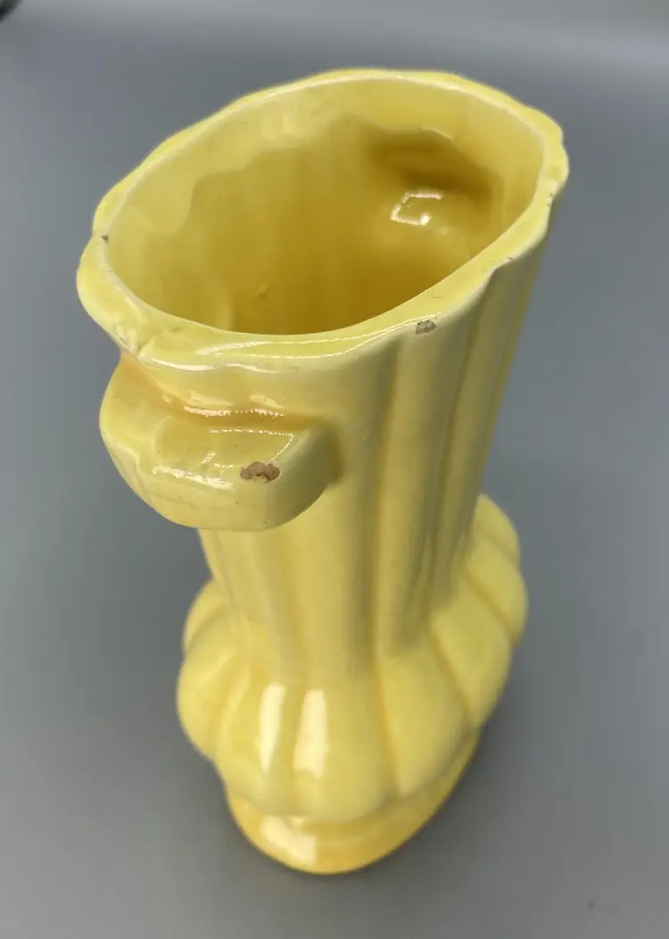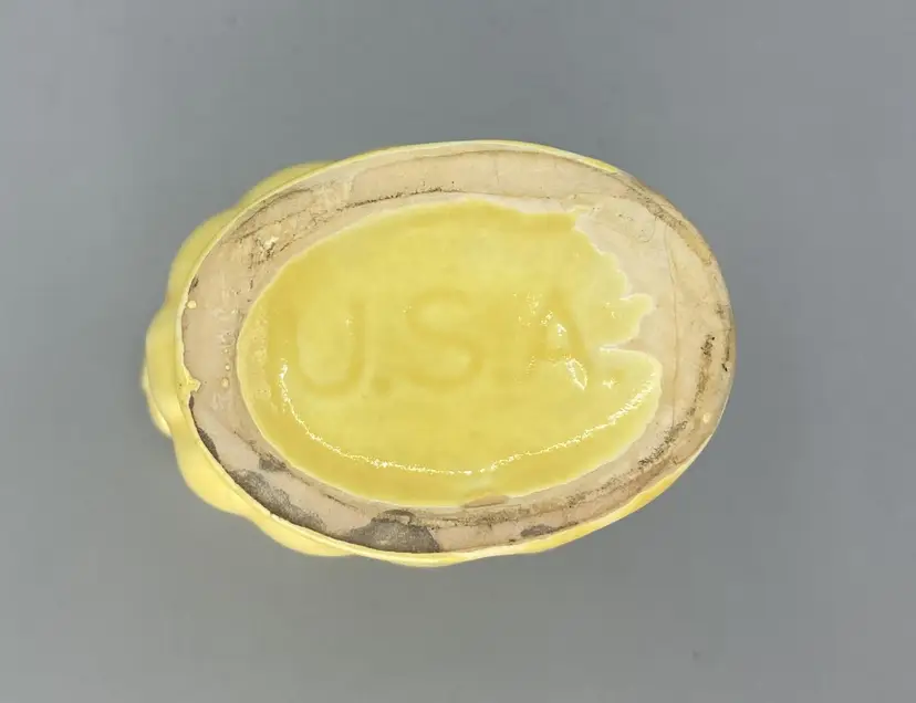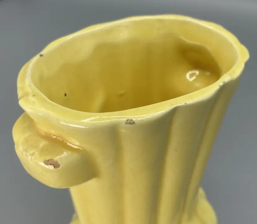 This vase is in good condition overall. It does have a couple chips, which are visible in the pictures. The bottom also has some wear. Please see pictures for specific details. I believe this vase is either Shawnee or McCoy, but can't be sure. This vase measures approximately 5 1/4" tall, 3 1/2" wide, 2 1/4" deep. The opening at the top is approximately 2" wide.