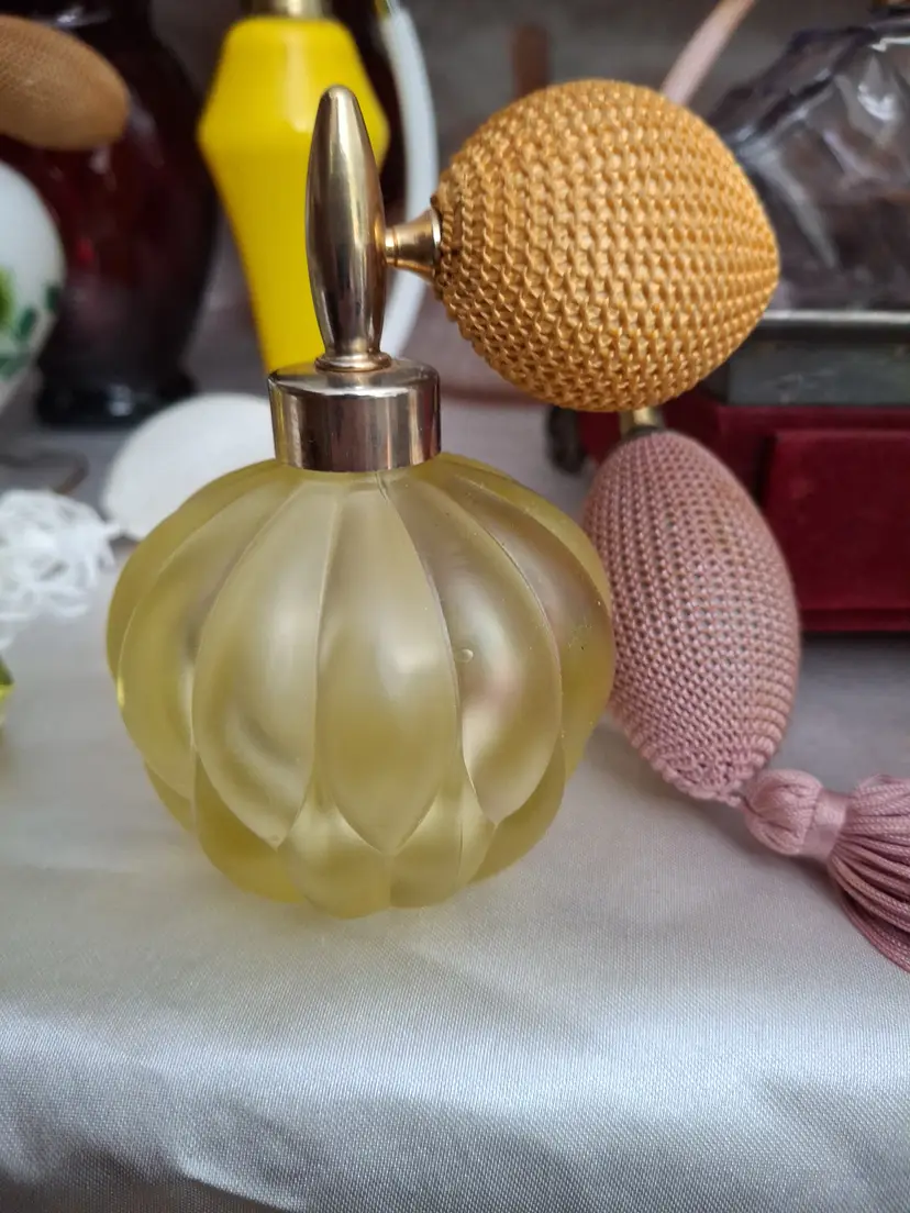 Vintage satin glass perfume atomizer in a soft yellow tone with ribbed melon form and gold-tone hardware. Classic feminine vanity piece with working bulb.