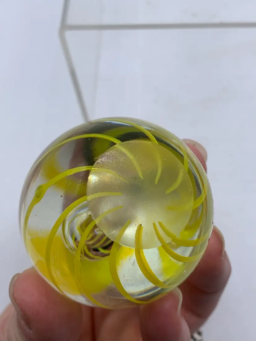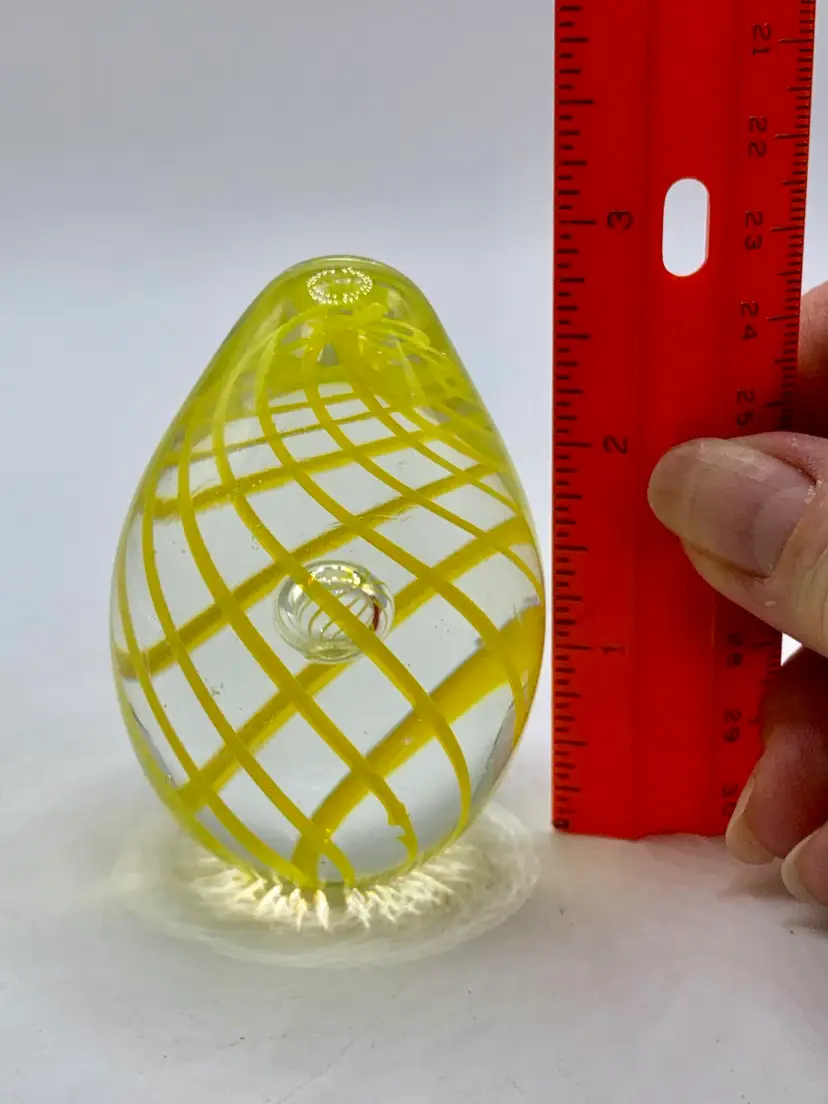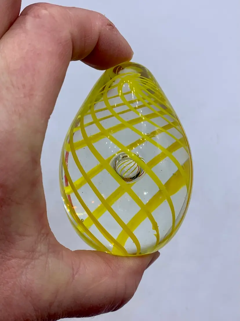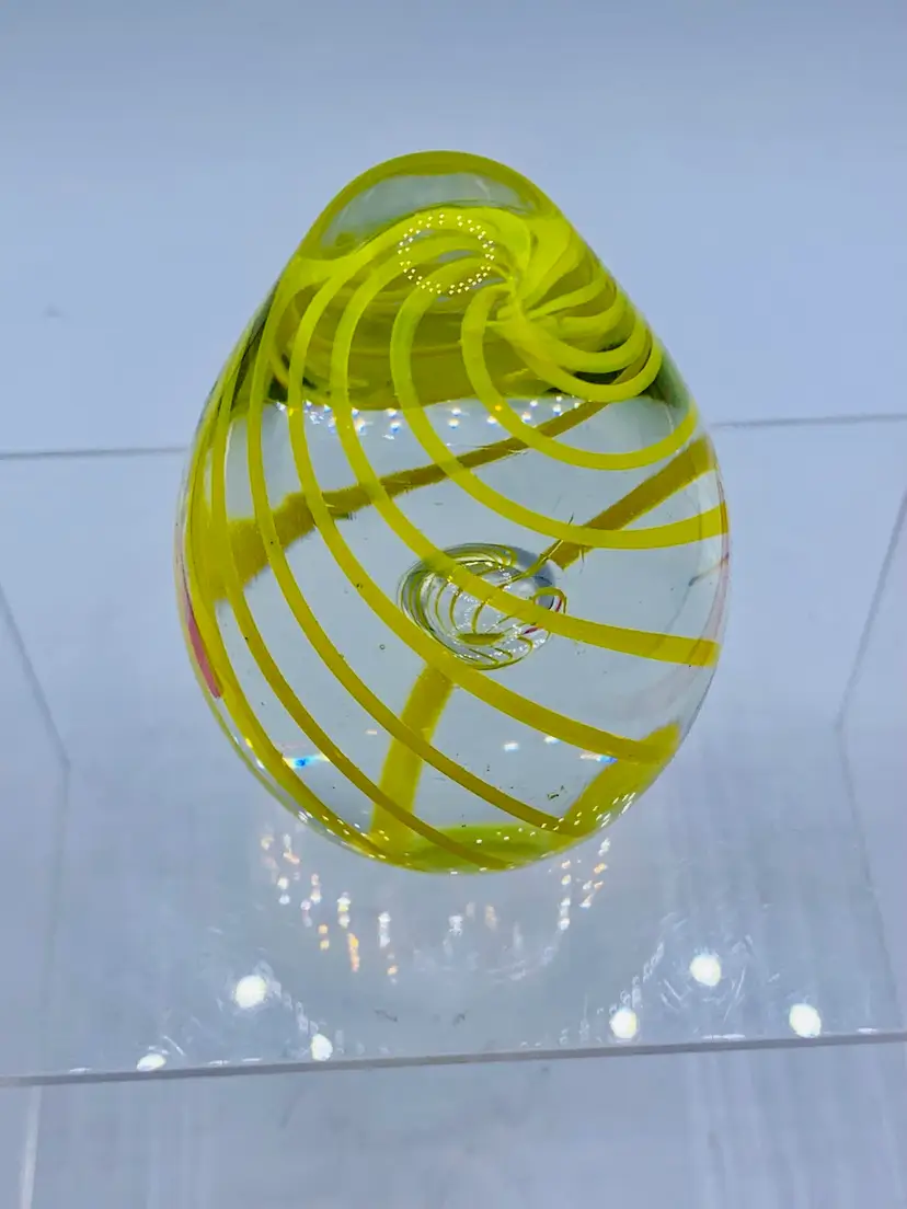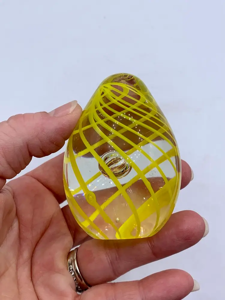 Vintage Yellow Spiral Glass Egg Shaped Paperweight With Enclosed Air Bubble.