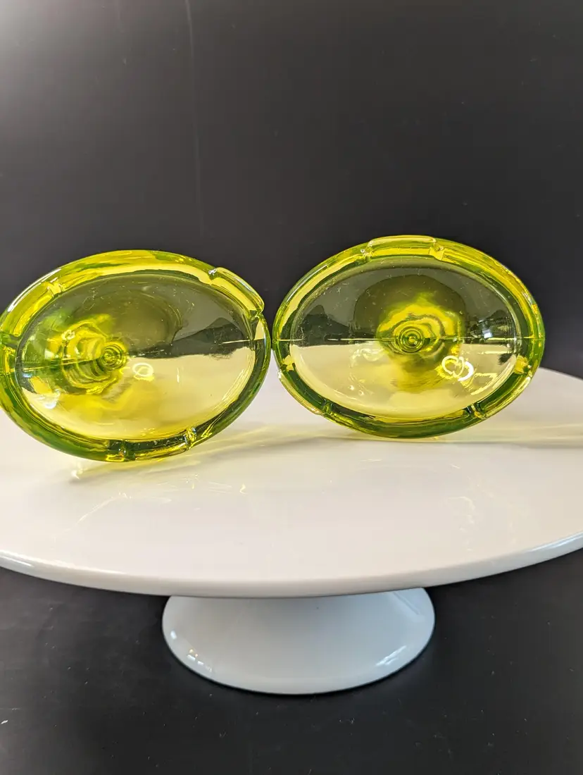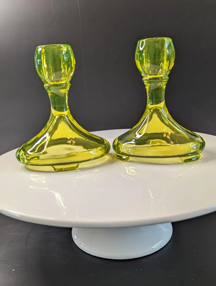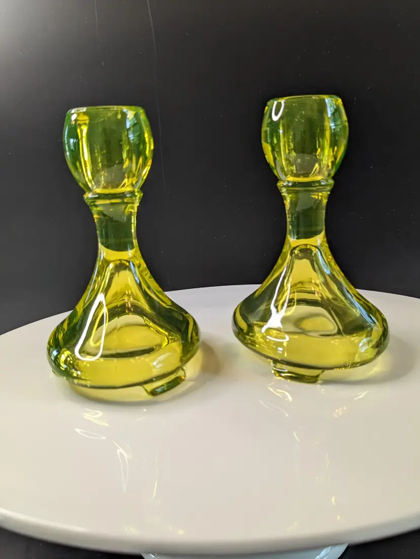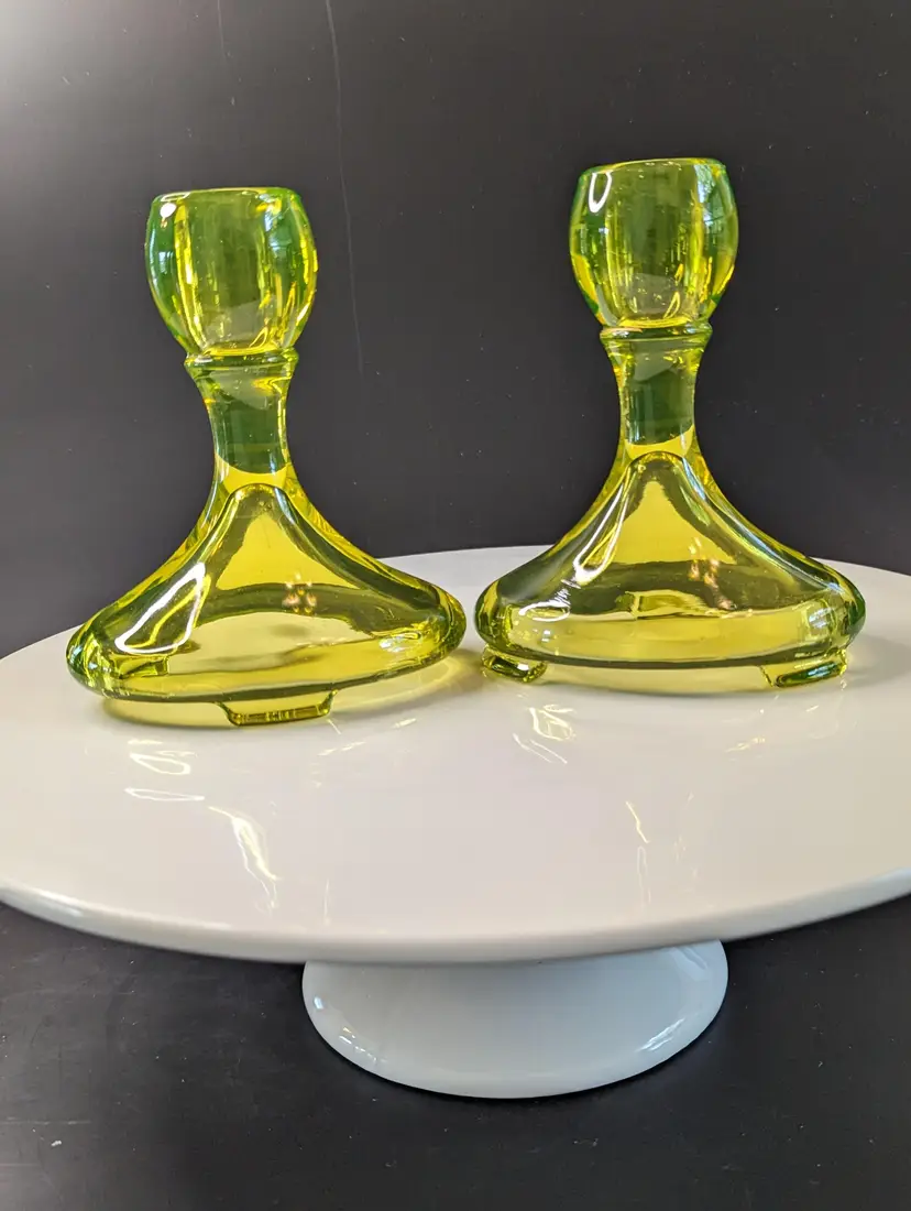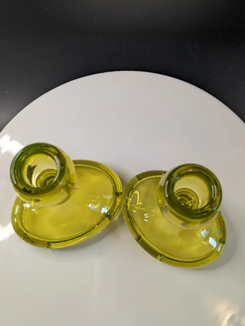 Add a pop of color to your home decor with this set of 2 vintage yellow glass candle holders. These vibrant pieces are perfect for adding a touch of elegance to any room. Each holder measures approximately 5 inches in height. Excellent condition. Please note that I'm happy to accept returns if you are unhappy with your purchase (buyer pays return shipping) and I'm happy to bundle items if more than one is purchased (as is safe) to save on shipping. I also refund shipping overages. Please let me know if you have any questions!