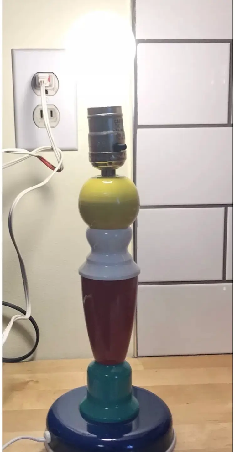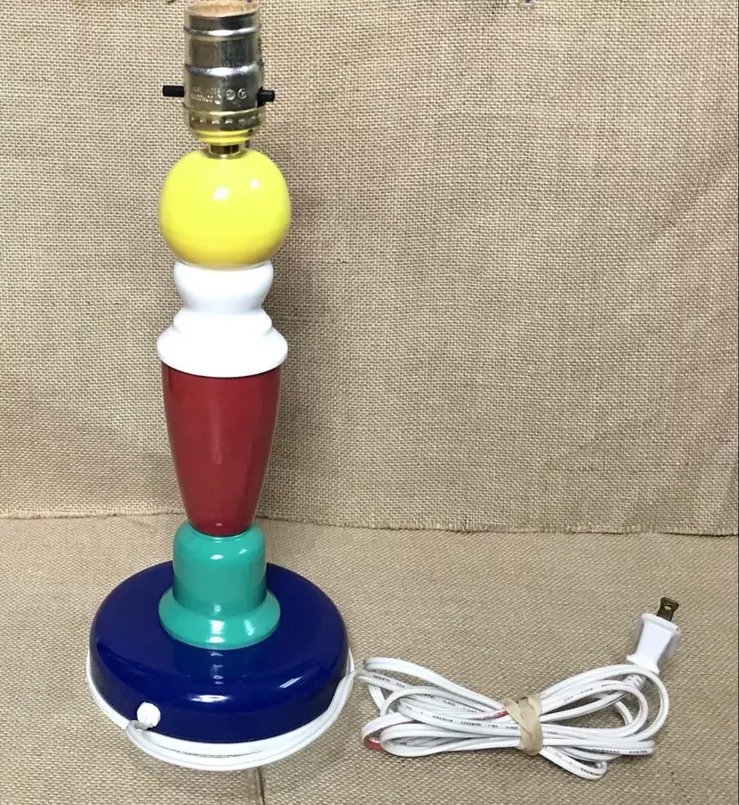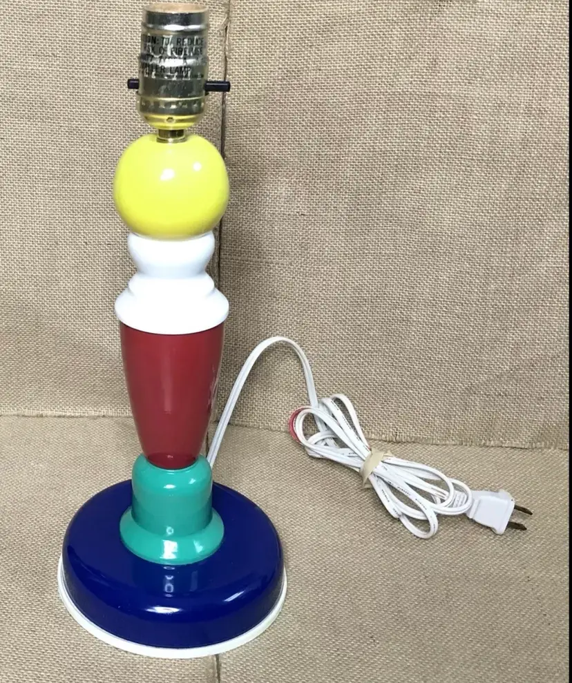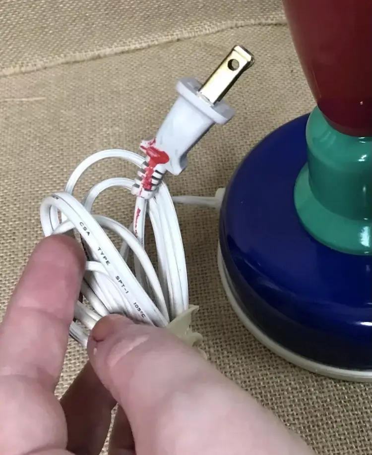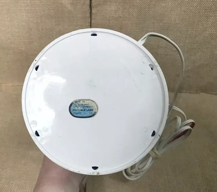 Condition: Some marks on lamp. Neck is crooked/leaning/bent. Some marks on bottom. A lot of wear to sticker on the bottom. Significant red staining, along with some other lighter marks, on cord and plug.