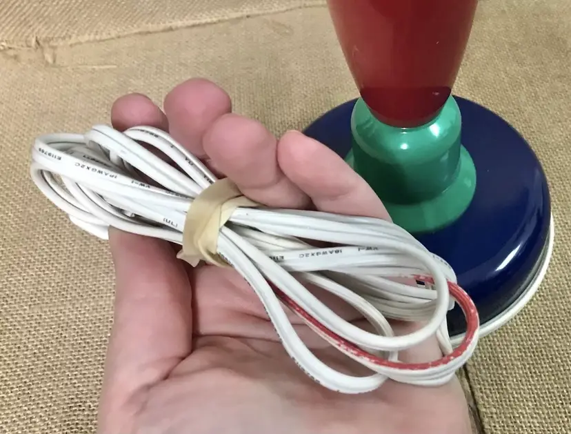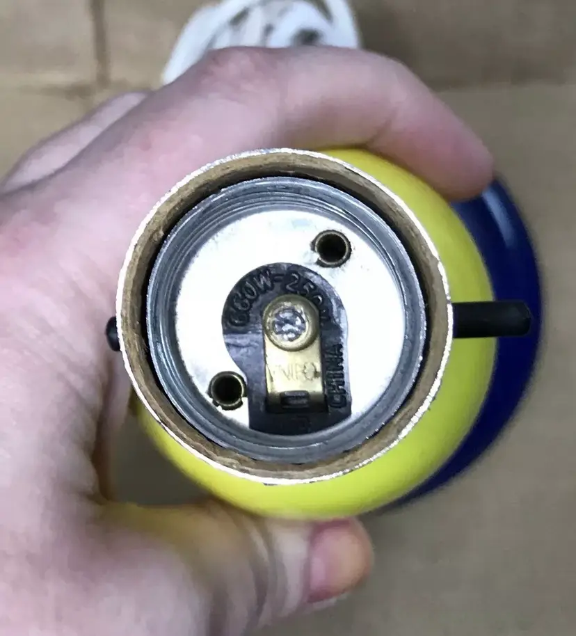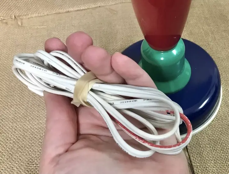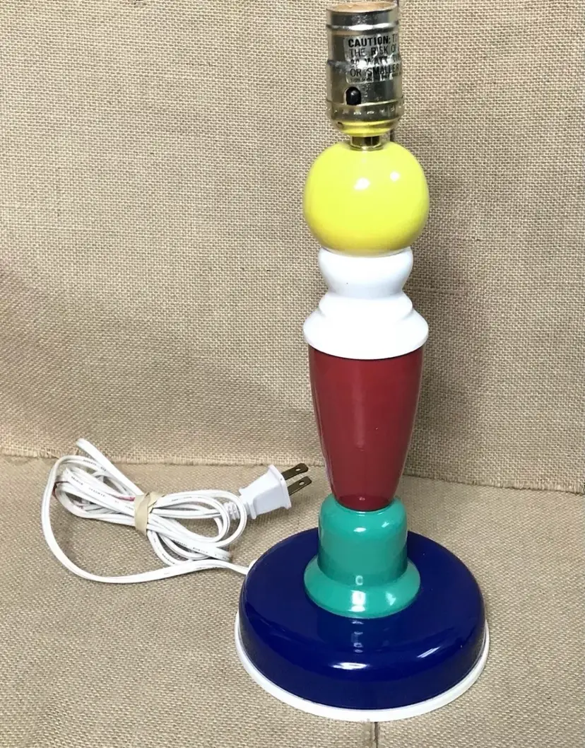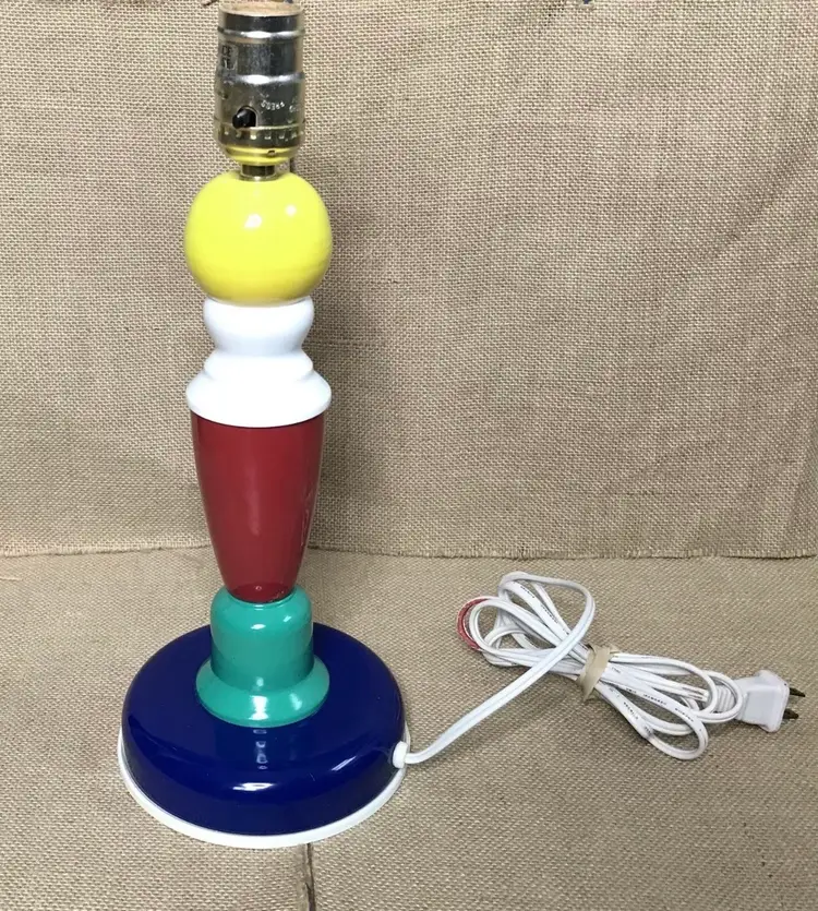Condition: Some marks on lamp. Neck is crooked/leaning/bent. Some marks on bottom. A lot of wear to sticker on the bottom. Significant red staining, along with some other lighter marks, on cord and plug.