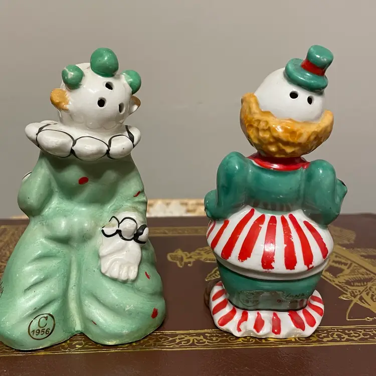 Excellent condition 1956 No chips or cracks Adorable kitsch clowns Missing stoppers Set of two 4” high 0000126