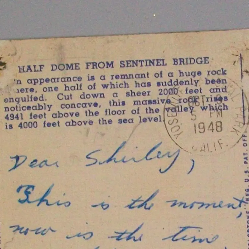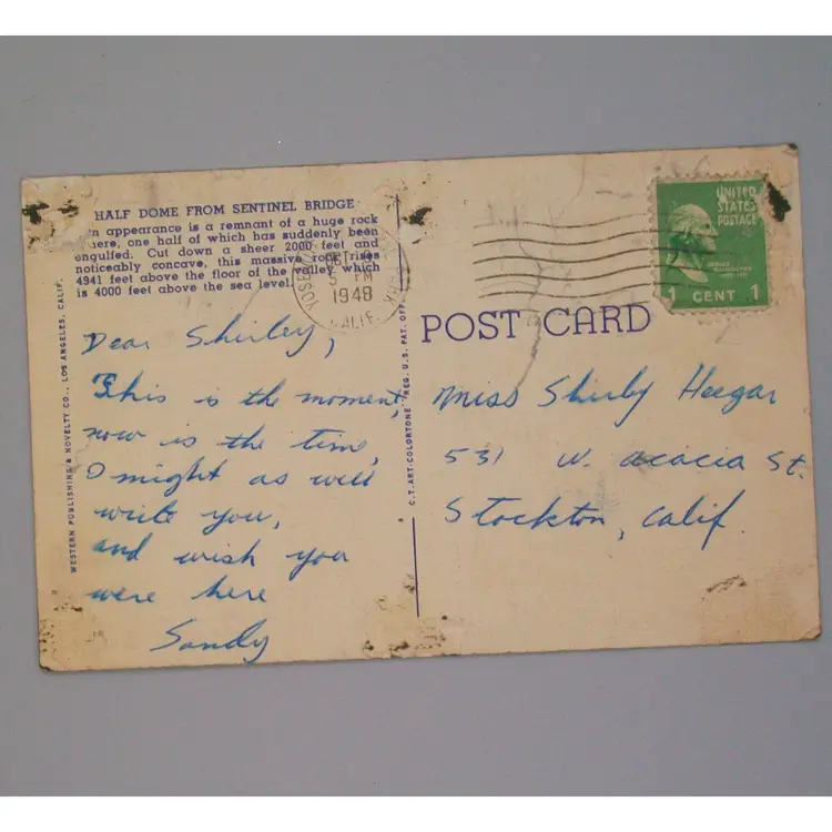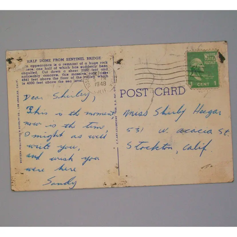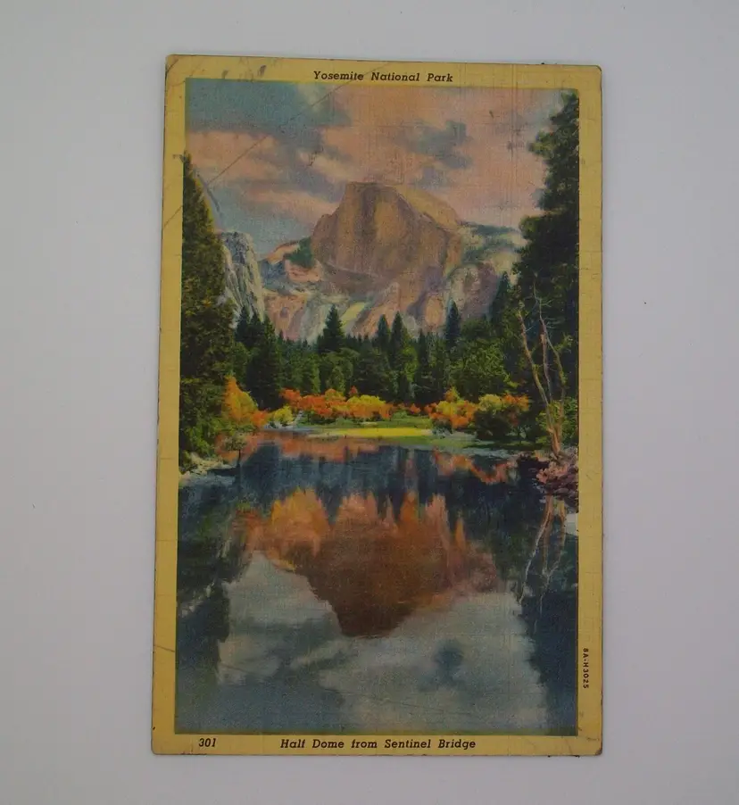 Capture the beauty of Yosemite National Park with this vintage linen postcard featuring a stunning view of Half Dome from Sentinel Bridge. Perfect for collectors or as a nostalgic keepsake. Some wear on back from being in scrapbook at one time