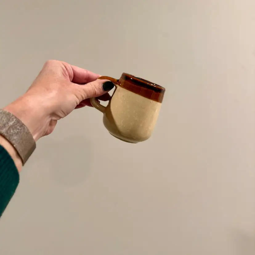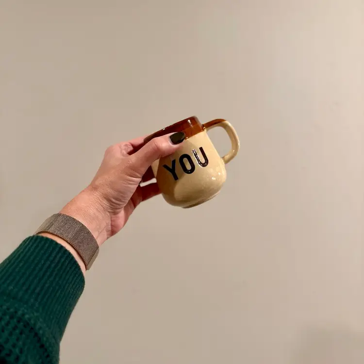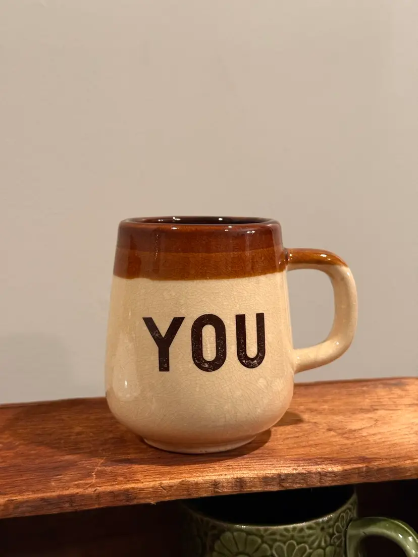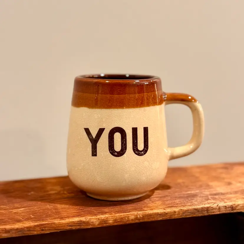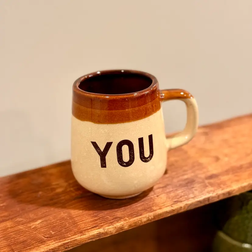 Adorable little stoneware mug with a brown-and-cream glaze and bold “YOU” on the front. Cute, rustic look with natural crazing. Perfect for a coffee bar, a gift, or display.