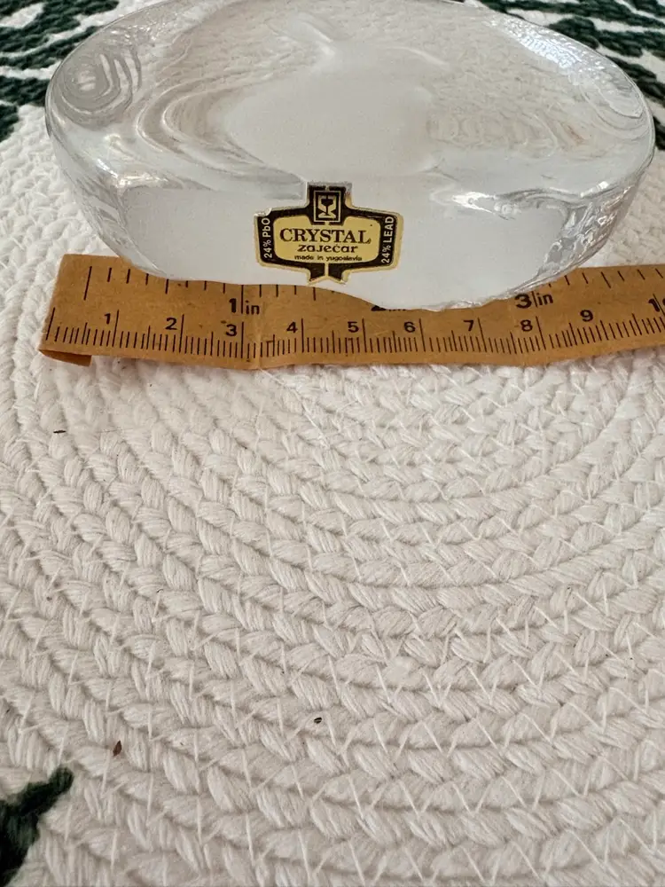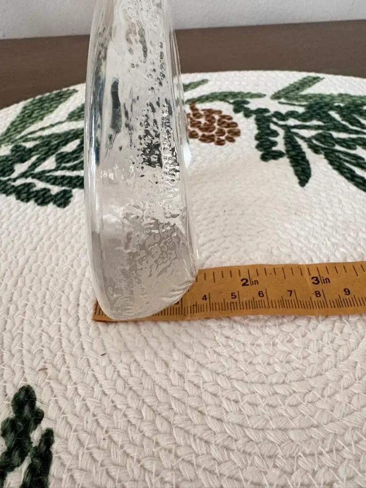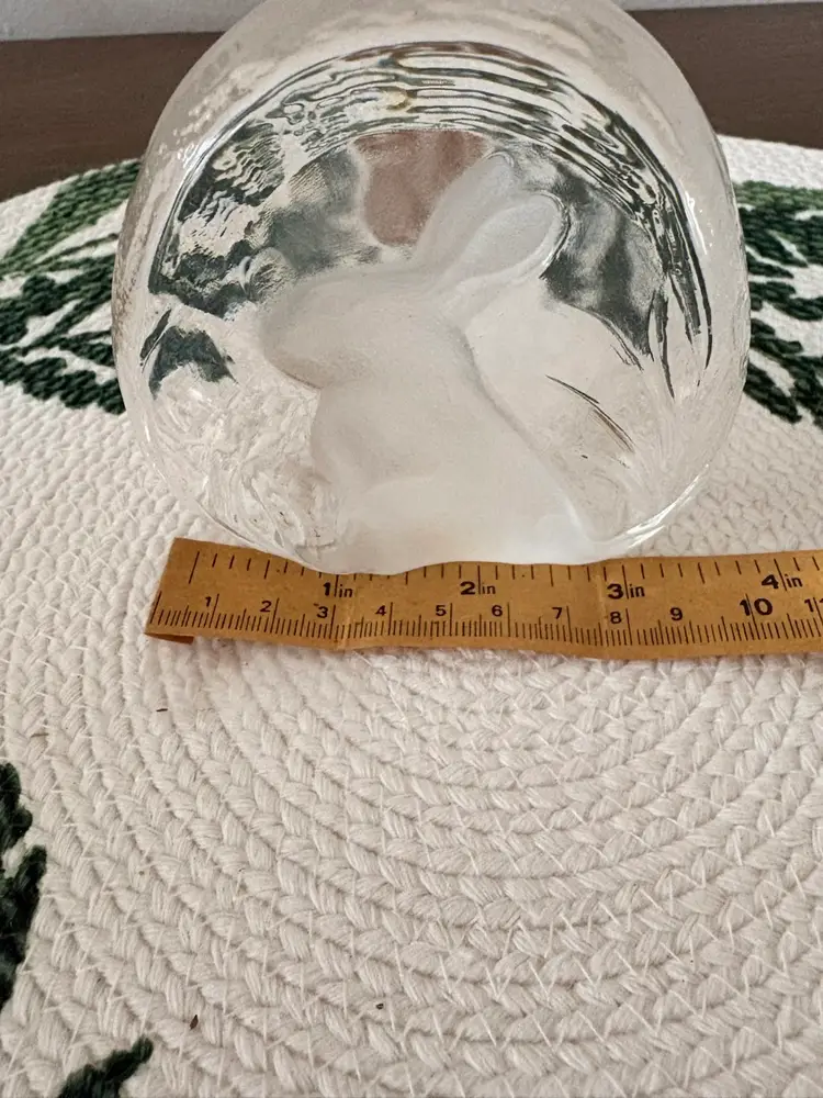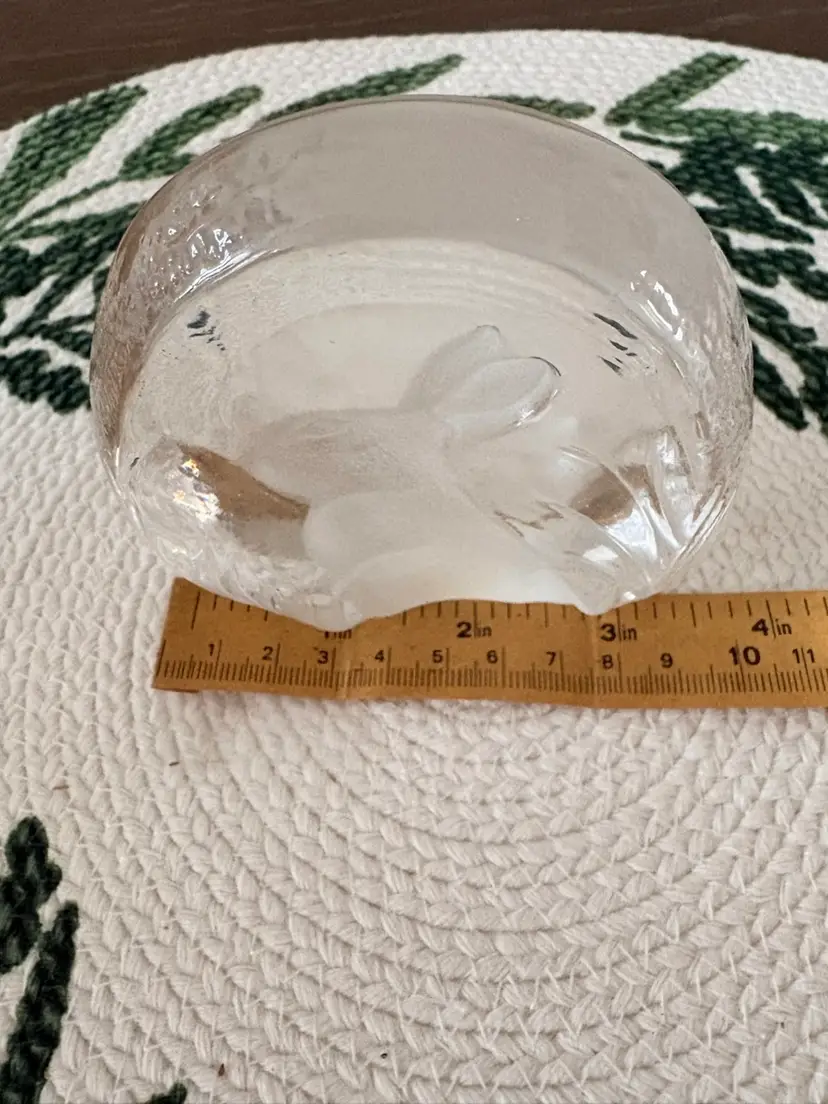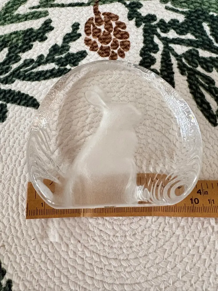 Frosted etched design of a rabbit sitting in grass measures approximately 3.75 inches in height and length, likely handcrafted in the 1970s.
