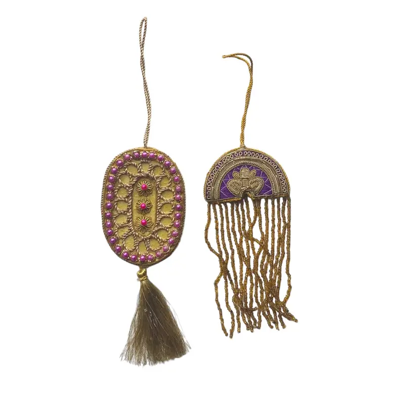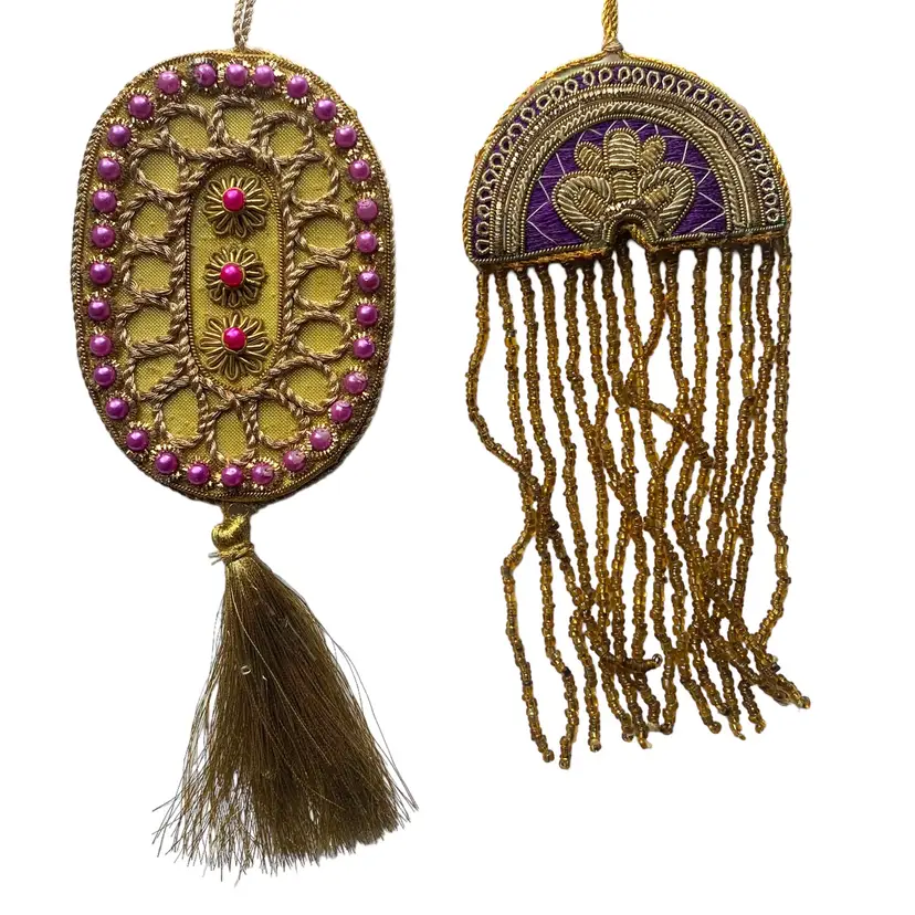 This set includes two ornaments, ready to hang on your tree. Whether you're personalizing your own tree or looking for a unique gift, these Zardozi ornaments are sure to add a touch of elegance to your holiday décor.