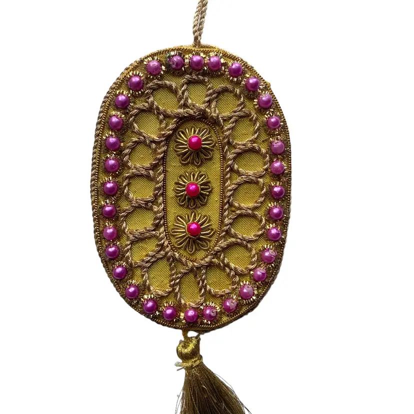 Add some vintage charm to your Christmas tree with this pair of Zardozi beaded & ball tussle ornaments. The ornate gold and purple design is perfect for any holiday occasion. Made of high-quality fabric and expertly embroidered in India, these small oval ornaments feature multicolor beads and characterful Zardozi family theme.
