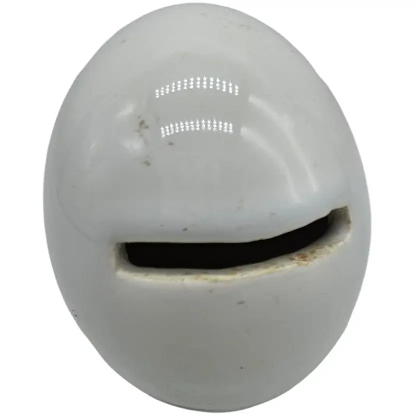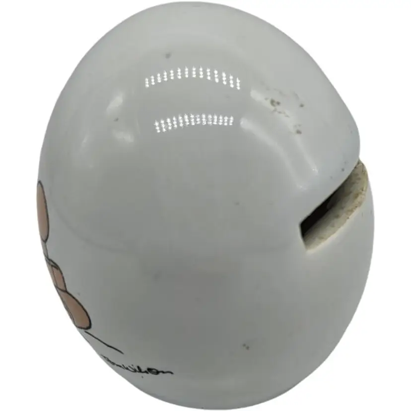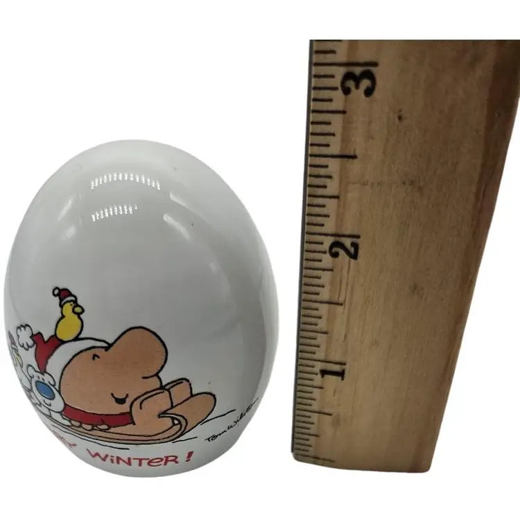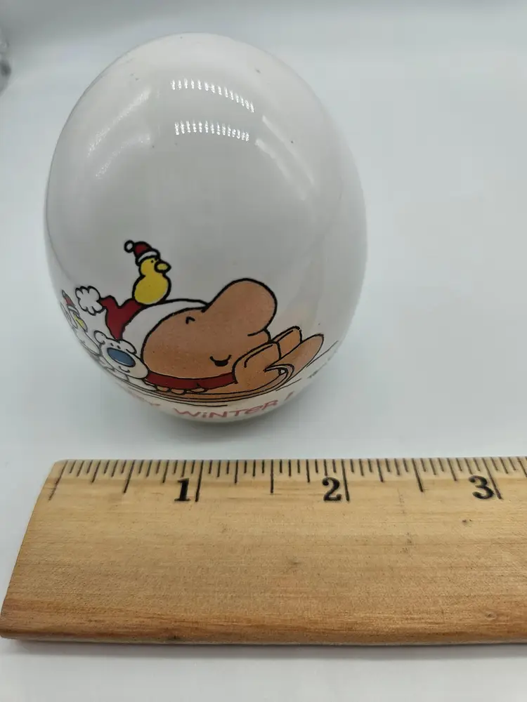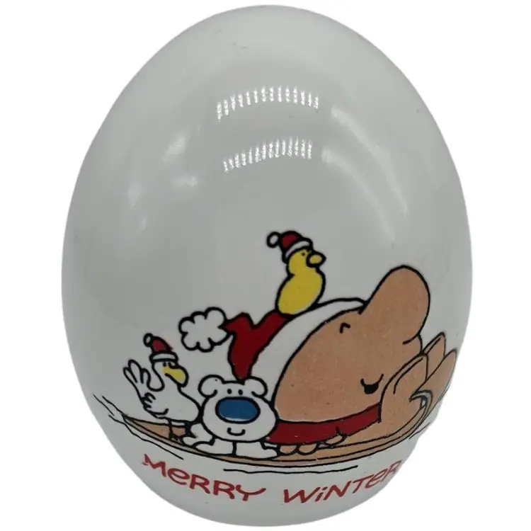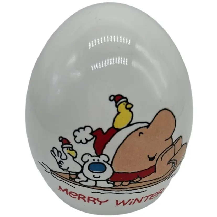 Cute ceramic egg bank with a festive 'Merry Winter' design. Perfect for holiday decor.