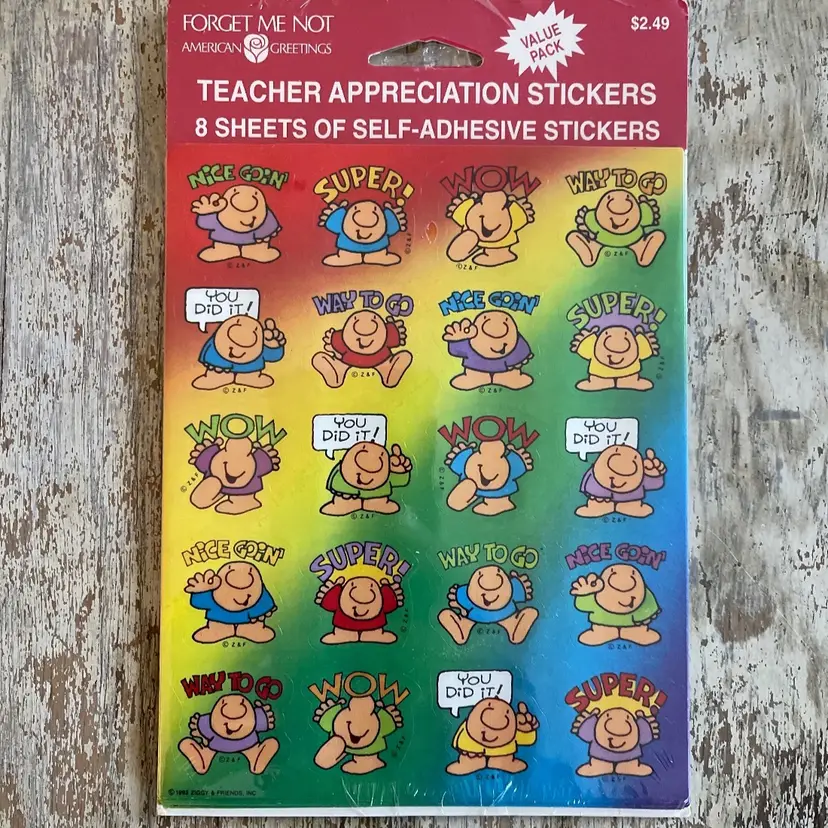 Vintage 1993 Ziggy Sticker Pack 8 sheets for Teachers, junk journaling or anyone who wants some positive encouraging sayings to share. This fun happy guy is on a colorful background with lots of great spellouts. New unopened package.