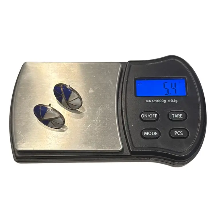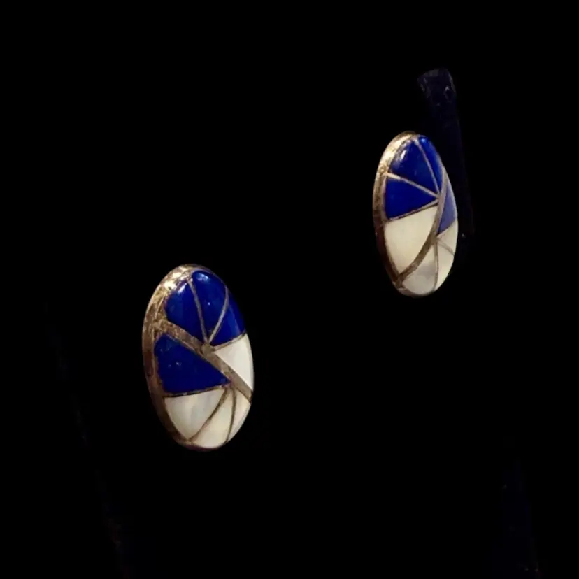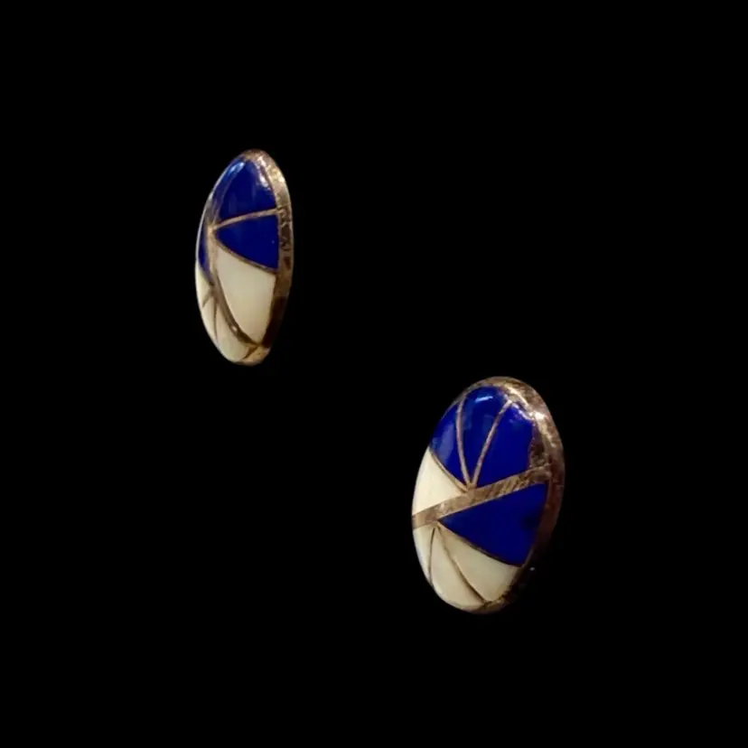 Vintage pair of Sterling silver post earrings featuring mother of pearl and lapis lazuli inlay. These earrings were made by Zuni silversmith Kal E Kallestewa and hallmarked on the back of one earring K.E.K.