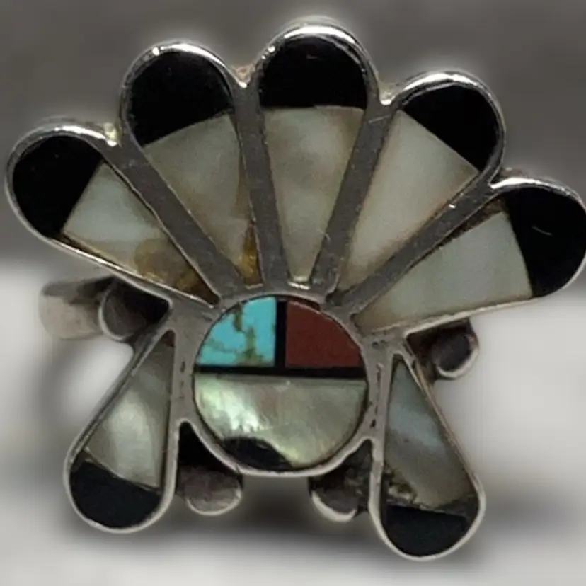 Turquoise, Shell,Coral and Jet,Mid-20 century,it’s showing age, the one who made this missed the black circle ⚫️ and was made in lower left of face , making it unique the size is between 8& 8 1/2