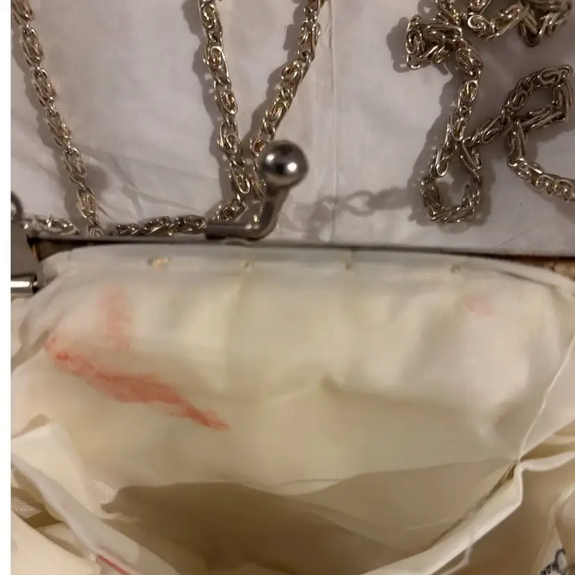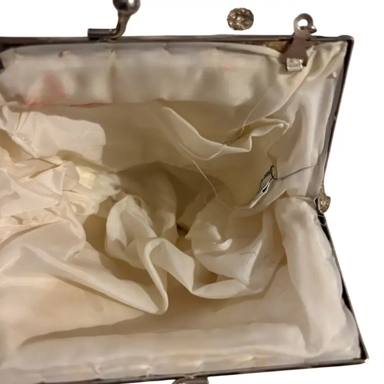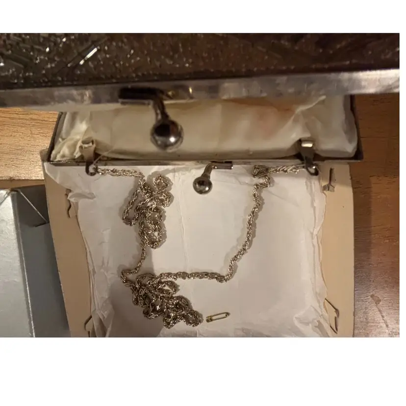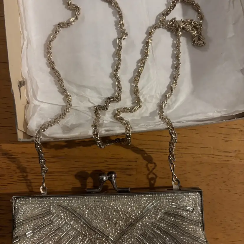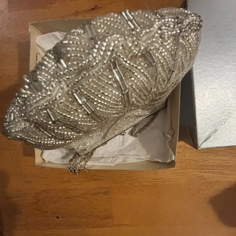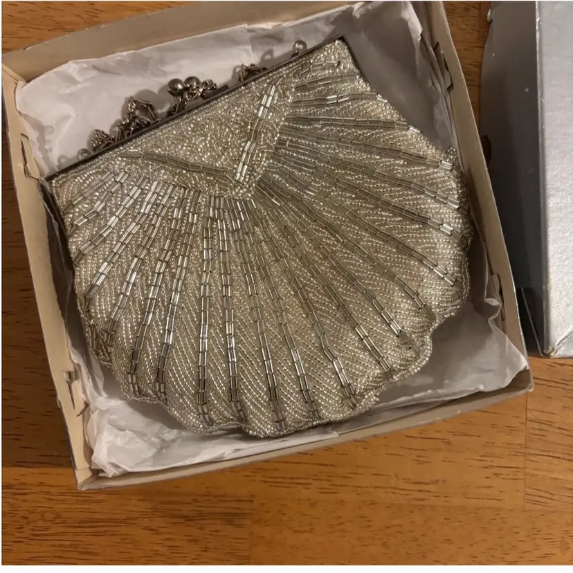 Still in Newark Department Store box ( The Hahne & Company department store was designed by architect Goldwin Starrett and built by prominent local businessman Julius Hahne in 1901. It was the first commercial building in Newark designed specifically as a department store) Vintage beaded clam shell evening clutch with a silver chain strap and a kiss clasp, possibly dating back to the late 1800’s Women's Looks to have maybe a lipstick mark on the inside but I want to leave it up to the buyer to try and clean All beads attached still!