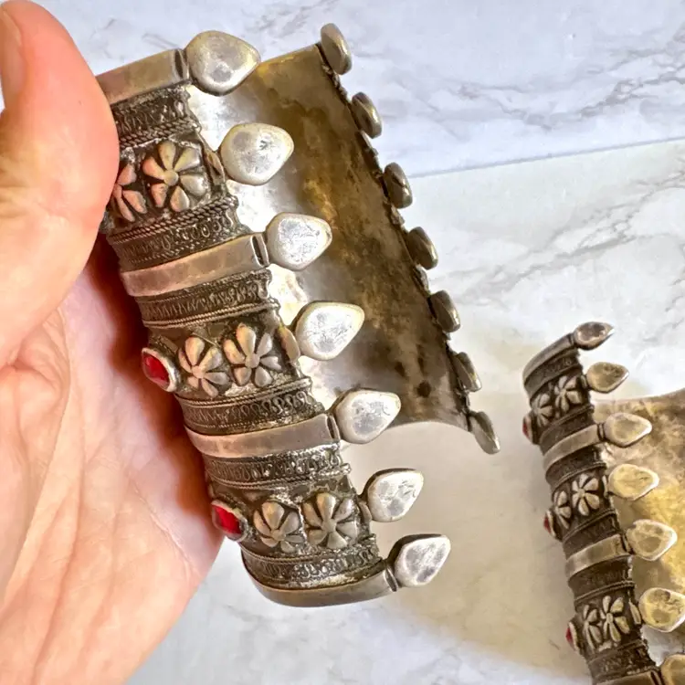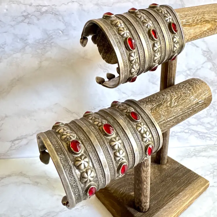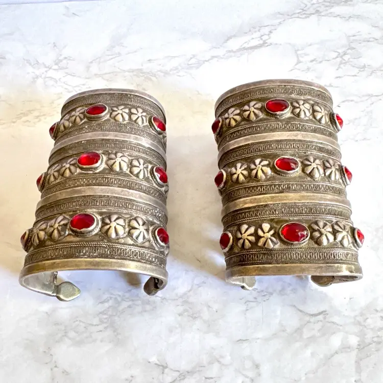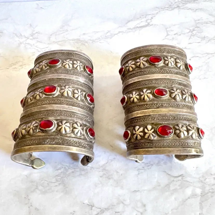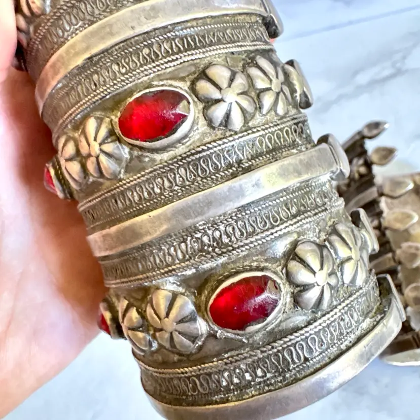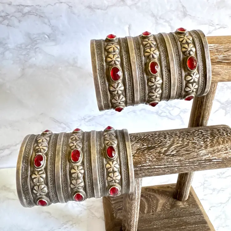 This pair of antique Turkmen cuff bracelets features intricate repoussé silver bands adorned with floral and geometric motifs, inlaid with rows of vibrant red stones, likely glass or unidentified materials, adding a striking aesthetic to the design. Handcrafted with detailed engravings and open cuff design for adjustable fit, these pieces reflect traditional nomadic jewelry styles, often worn as symbols of status and heritage. Likely from a mid-19th to early 20th-century Central Asian workshop, they serve as both striking accessories and potent cultural amulets, ideal for collectors or those seeking authentic ethnic jewelry.