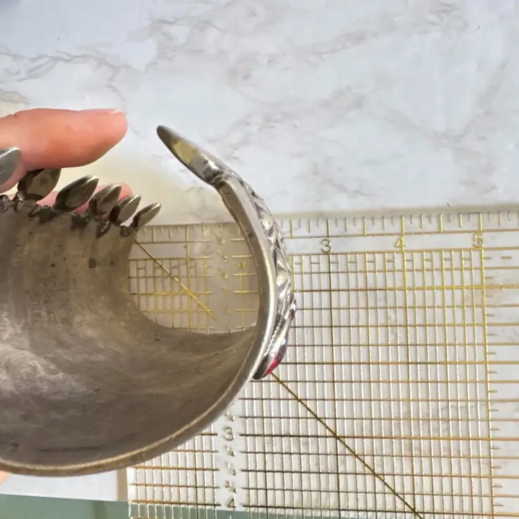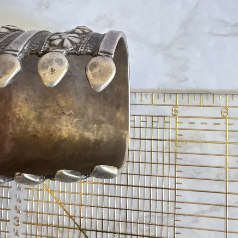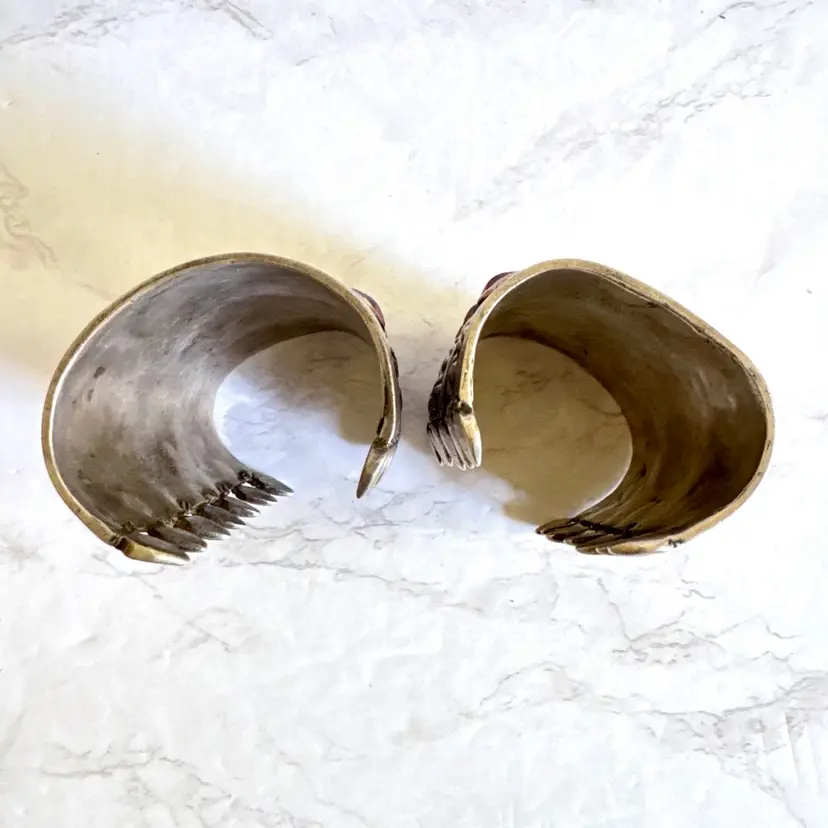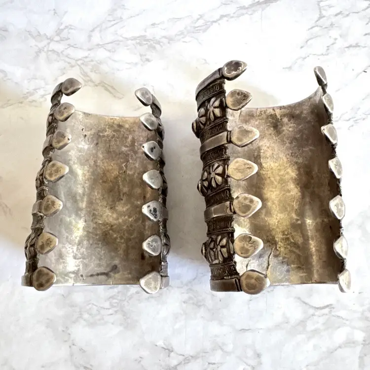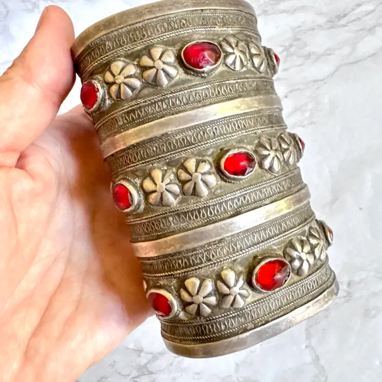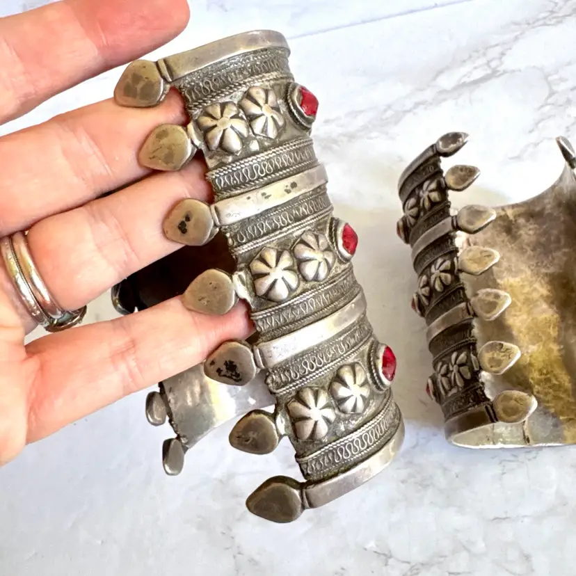 This pair of antique Turkmen cuff bracelets features intricate repoussé silver bands adorned with floral and geometric motifs, inlaid with rows of vibrant red stones, likely glass or unidentified materials, adding a striking aesthetic to the design. Handcrafted with detailed engravings and open cuff design for adjustable fit, these pieces reflect traditional nomadic jewelry styles, often worn as symbols of status and heritage. Likely from a mid-19th to early 20th-century Central Asian workshop, they serve as both striking accessories and potent cultural amulets, ideal for collectors or those seeking authentic ethnic jewelry.