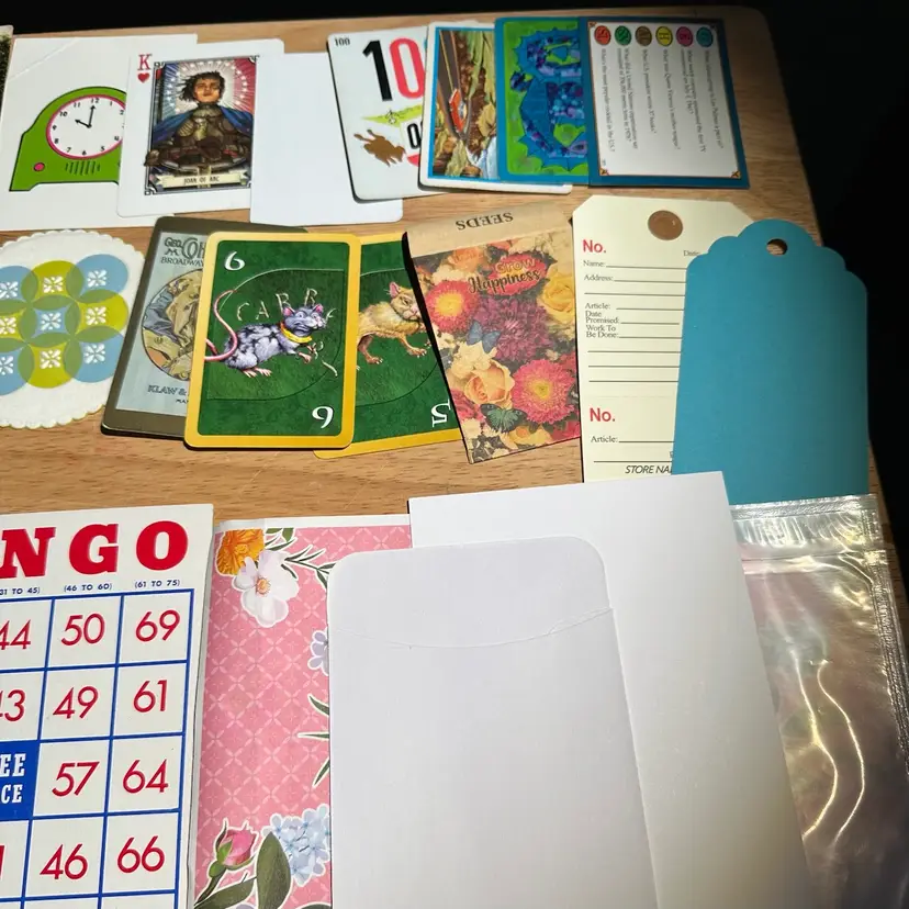 New: Floral bag adhesive shaker pouch Library pocket with library card Ticket strip Manila repair tag Blue tag Seed packet Verticle lined index card Blank ‘playing card’ Blank postcard 2 Harry Potter Uno cards Girl Power playing card