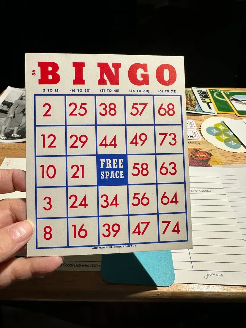 Vintage: Bingo card Paper coaster Trivial pursuit card Dragon playing card theatre jester playing cards Lighthouse AAA card Milles Bourne card Clock flash card Math flash card Photo
