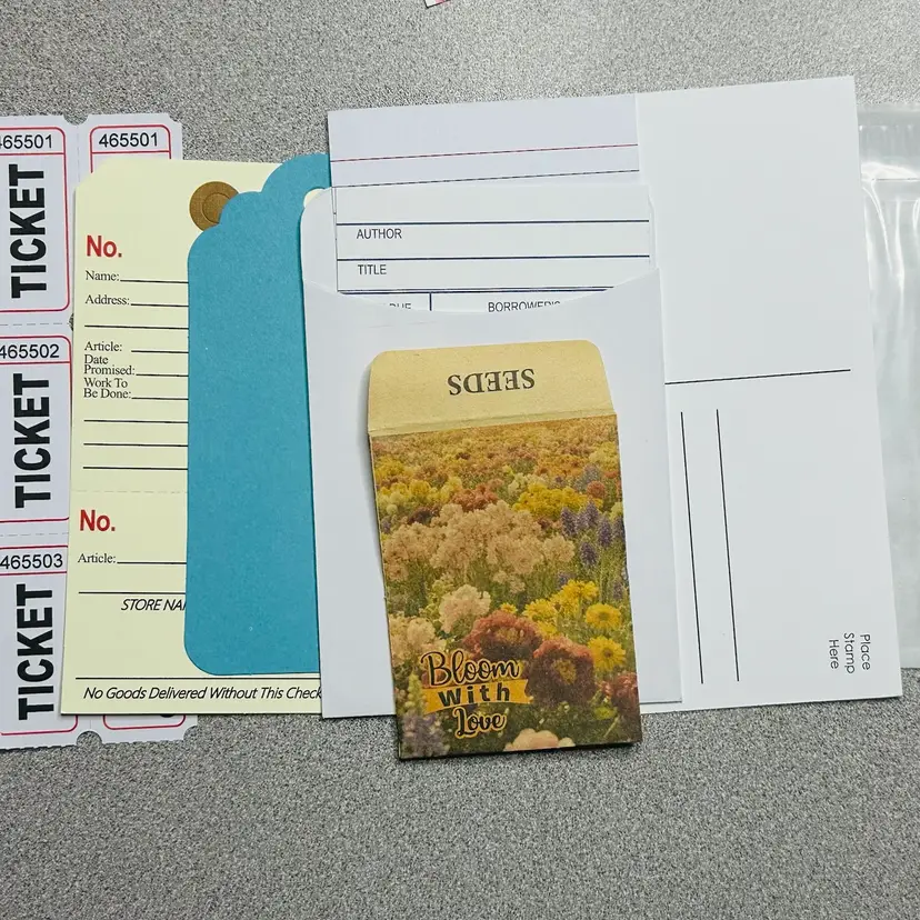 New: Floral bag adhesive shaker pouch Library pocket with library card Ticket strip Manila repair tag Blue tag Seed packet Verticle lined index card Blank ‘playing card’ Blank postcard 2 Harry Potter Uno cards Girl Power playing card