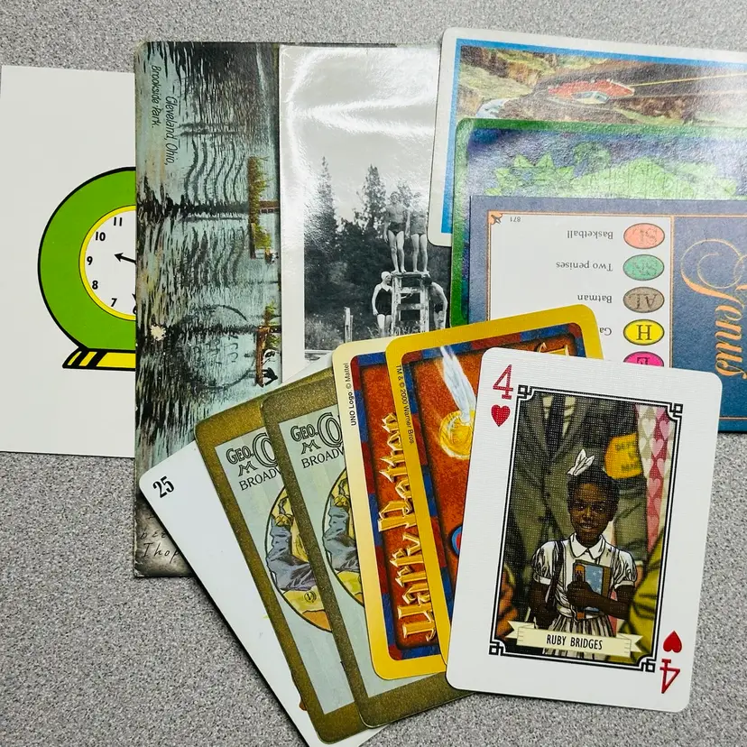 Vintage: Bingo card Trivial pursuit card Dragon playing card theatre jester playing cards Lighthouse AAA card Milles Bourne card Clock flash card Math flash card Photo