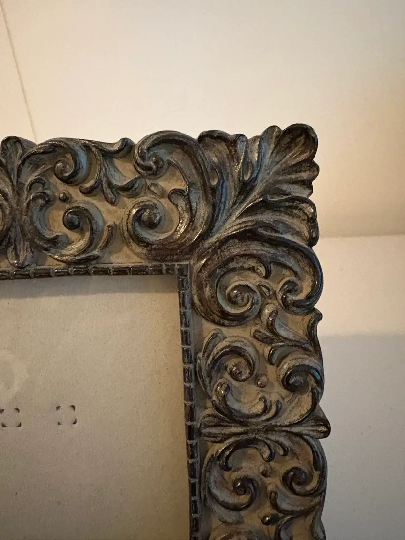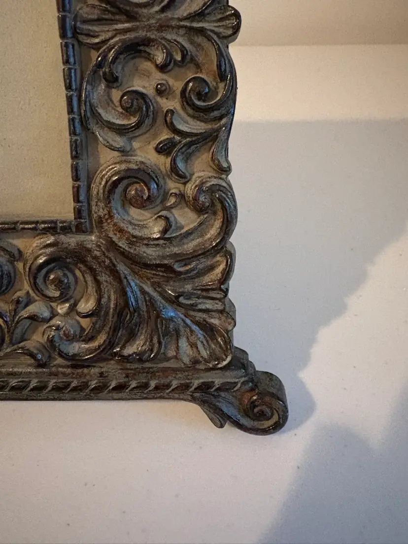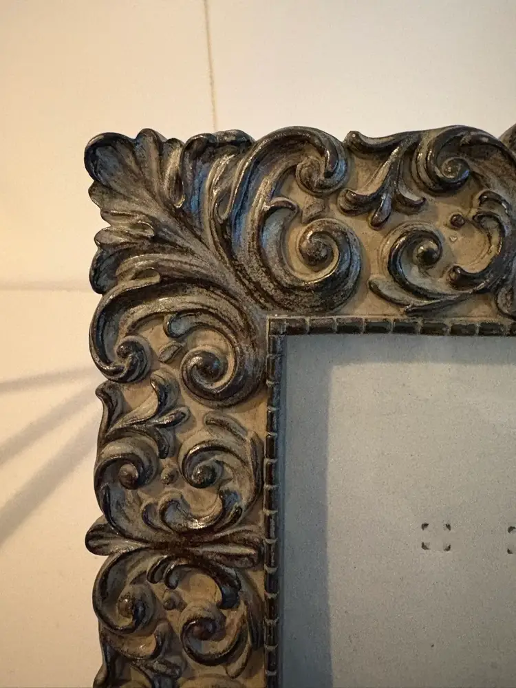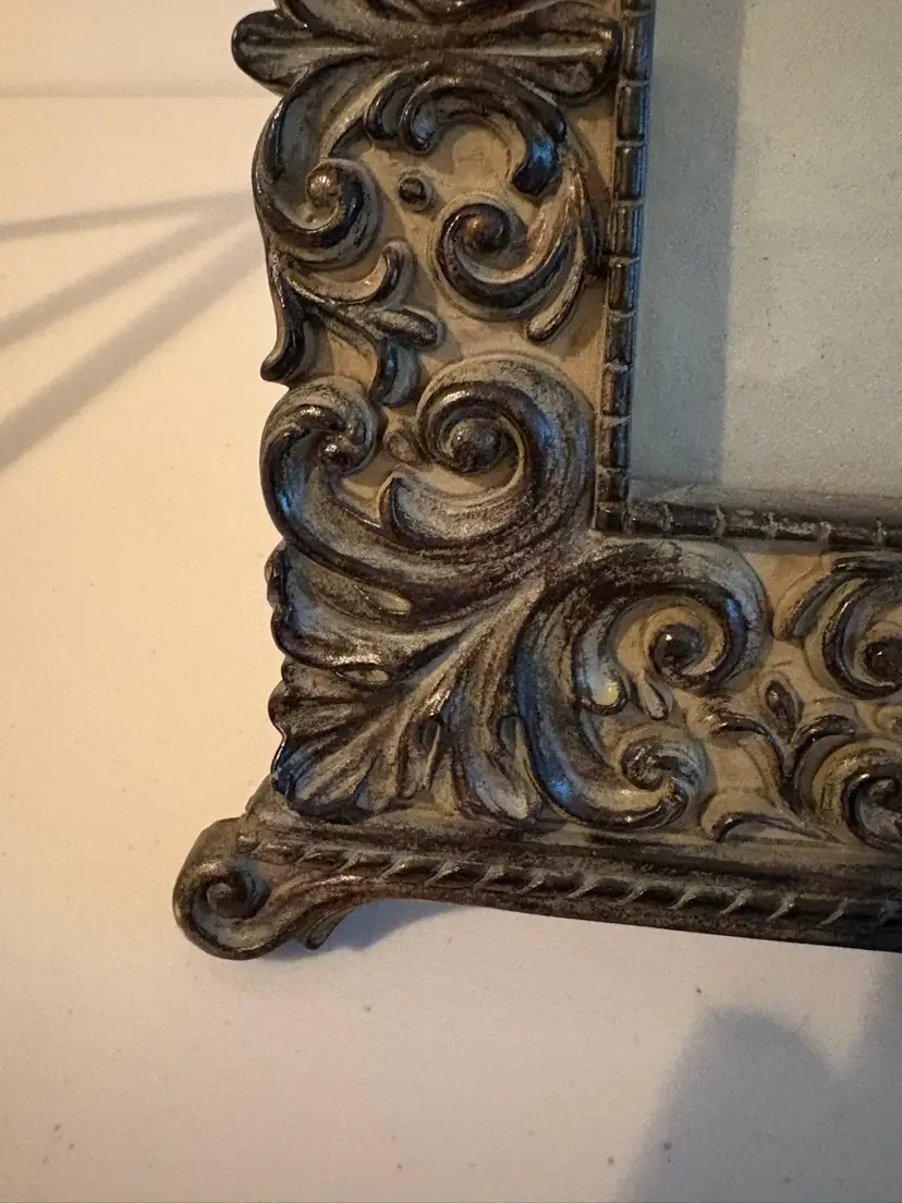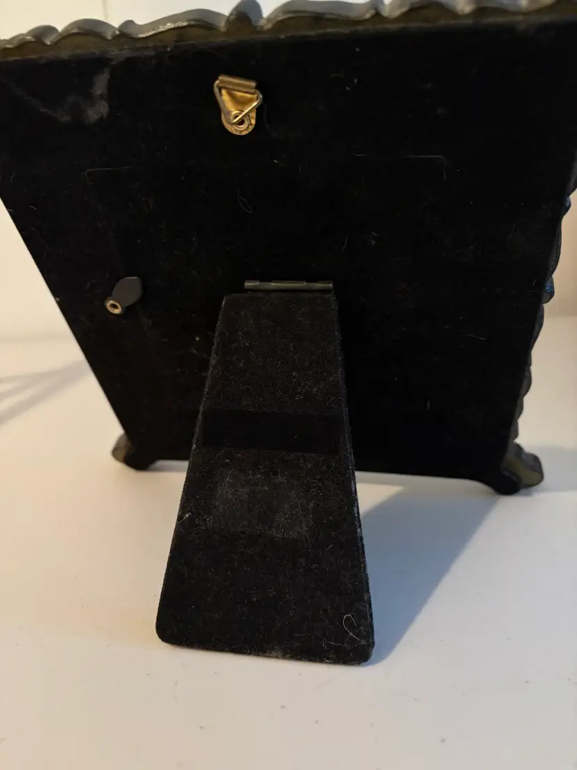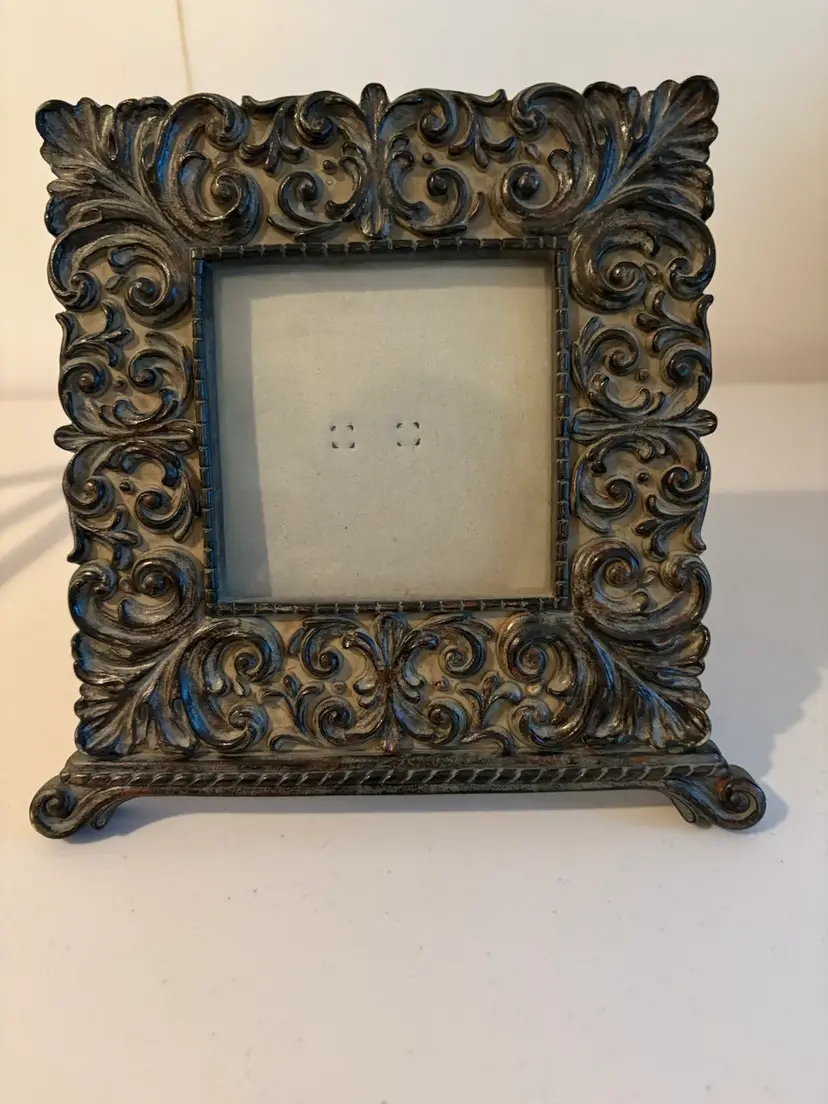 This is a very detailed heavy resin photo picture frame that measures 8" x 8" and accepts a 4" x 4" picture. It has an easel and a hanger on the back. The black velvet backing shows some wear. A very stylish frame that reminds me of an Italian, Tuscan or Mediterranean feel