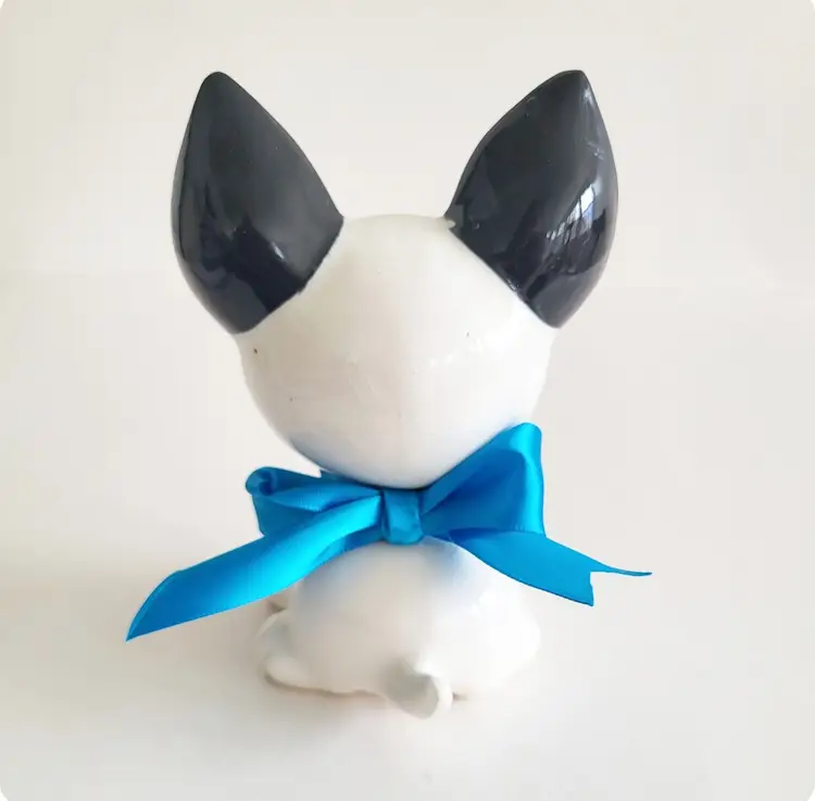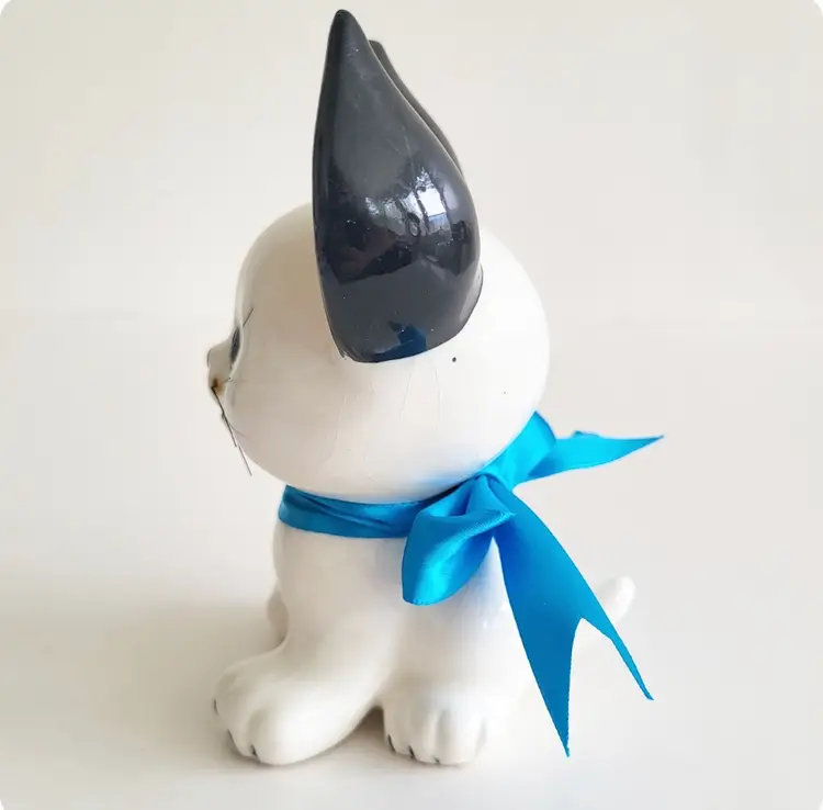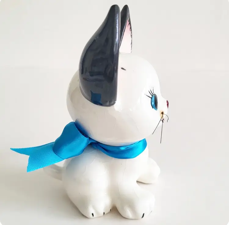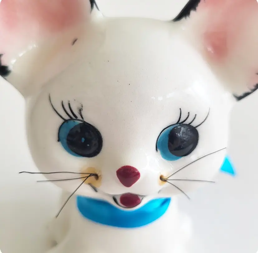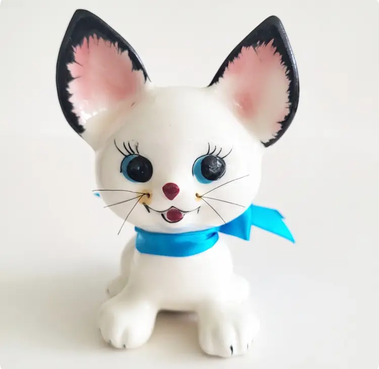 Vintage 1960s Brinns Japan kitschy kitty figurine. Scroll for all details! No chips, there is crazing present in the glaze. Whiskers are present. Added blue bow, can easily come off. Measures 3.5 in x 5.25 in x 3.75 in.
