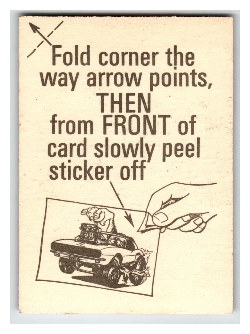 The reverse side of the card provides clear instructions for peeling the sticker: "Fold corner the way arrow points, THEN from FRONT of card slowly peel sticker off." This indicates a traditional peel-off sticker format, characteristic of vintage non-sport sticker collections. This unique piece is perfect for collectors of non-sport stickers, monster art, hot rod memorabilia, or Volkswagen themed collectibles, adding a distinctive touch to any collection.