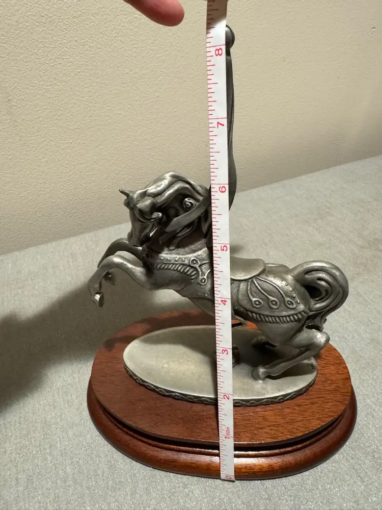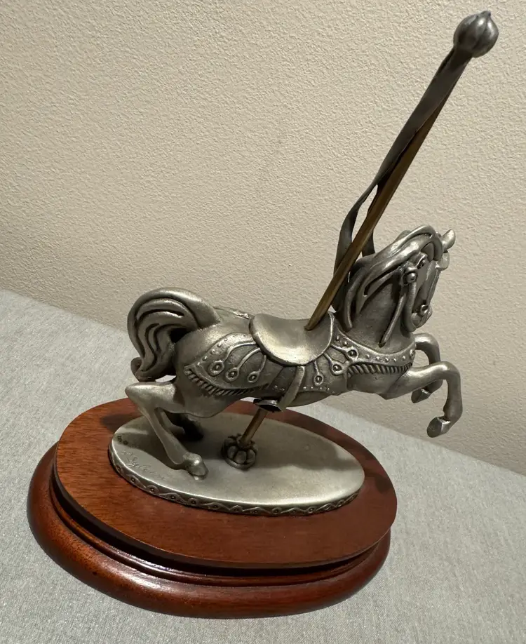 This elegant silver carousel horse sculpture adds a touch of whimsy to any space. Its intricate design and pewter finish make it a standout piece for art lovers.