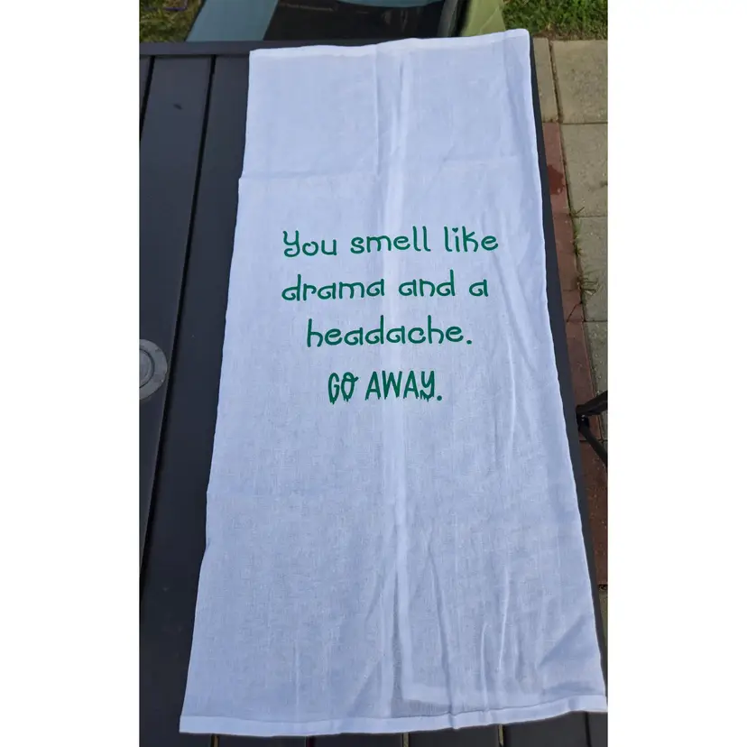 White kitchen towel with green vinyl text: 'You smell like drama and a headache. GO AWAY.' Perfect for adding a touch of humor to your kitchen. 100% cotton flour sack towel, permanent vinyl design.