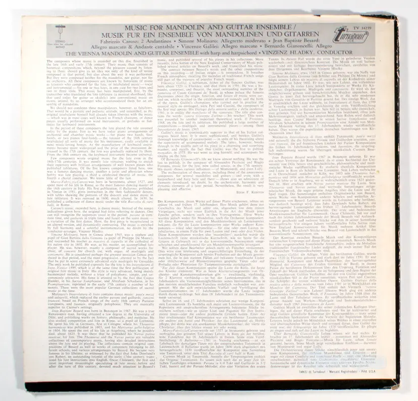 Music For Mandolin And Guitar Ensemble, by Vinzenz Hladky, is a 1968 vinyl release featuring a collection of classical works by composers such as Fabrizio Caroso, Simone Molinaro, Vincenzo Galilei, Jean-Baptiste Besard, and Bernardino Gianoncelli. Recorded with harp and harpsichord accompaniment, the album showcases Renaissance and Baroque dance music, with tracks like Andantino by Caroso and Allegro by Gianoncelli highlighting the ensemble’s delicate interplay of plucked strings. Its historical significance lies in its revival of early music performed on period-appropriate instruments, contributing to the 1960s early music movement that sought to authentically recreate historical performance practices. The album, released on the Turnabout label, is noted for its influence on later works, such as inspiring Ottorino Respighi’s suites of ancient airs and dances. No specific tracks from this album are identified as hit singles in available sources, as it primarily appeals to niche classical and early music audiences rather than mainstream charts.