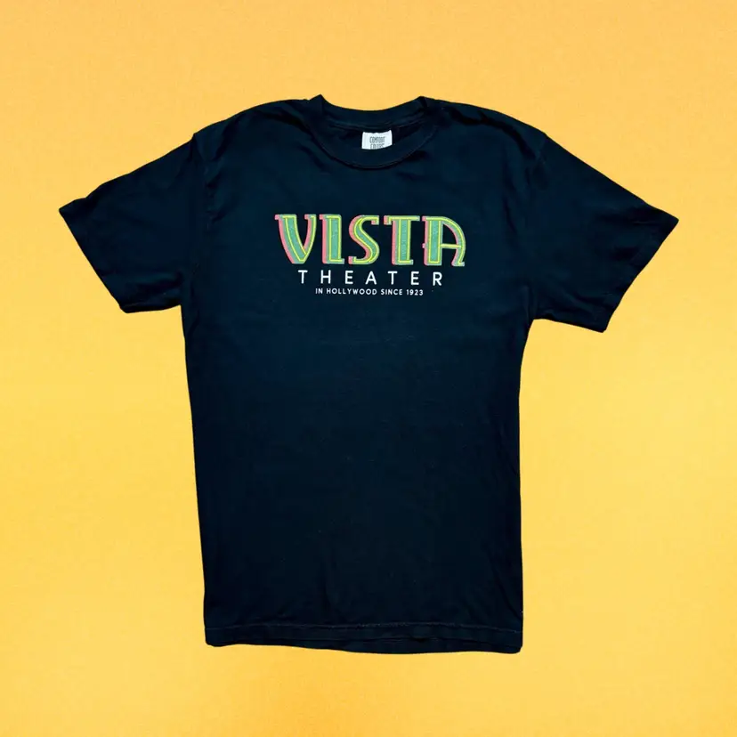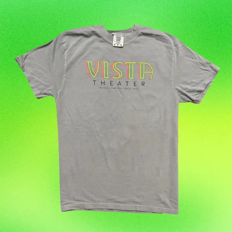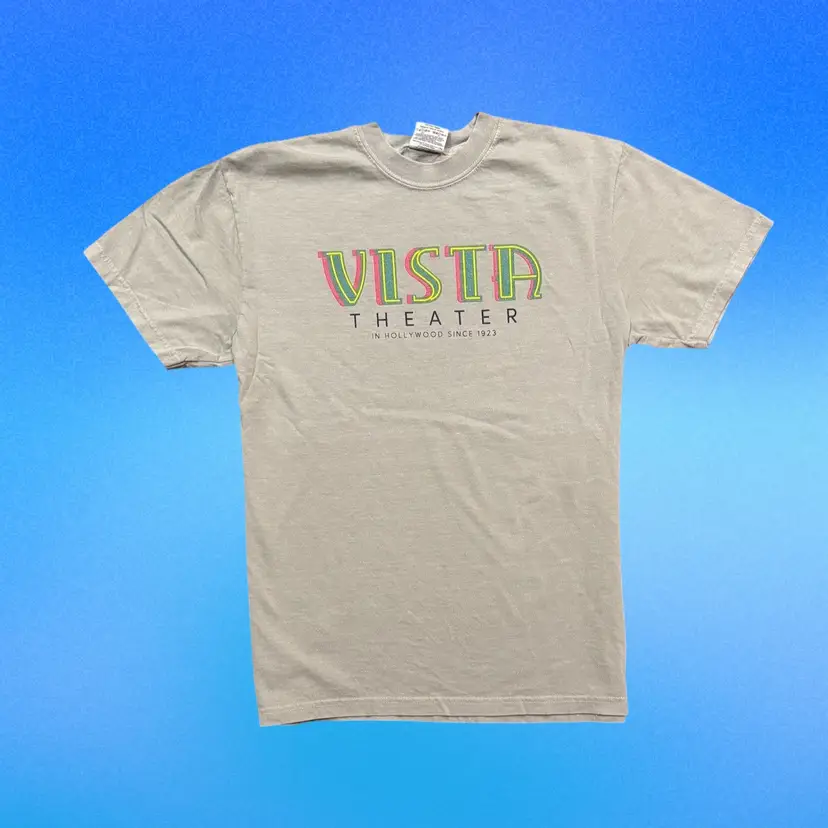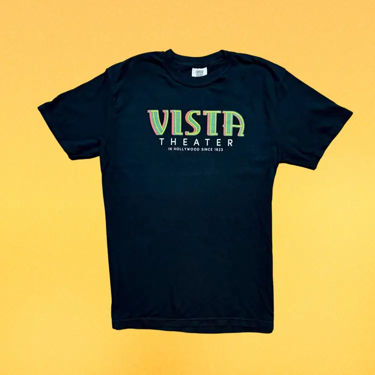 Vista Theater T-shirts available in four colors: Black, Grey, White and Khaki. Use pulldown menu to select colors and sizes. The Vista Theater is located in Hollywood, CA and owned by Quentin Tarantino.