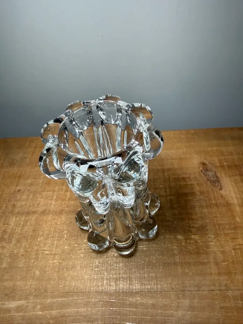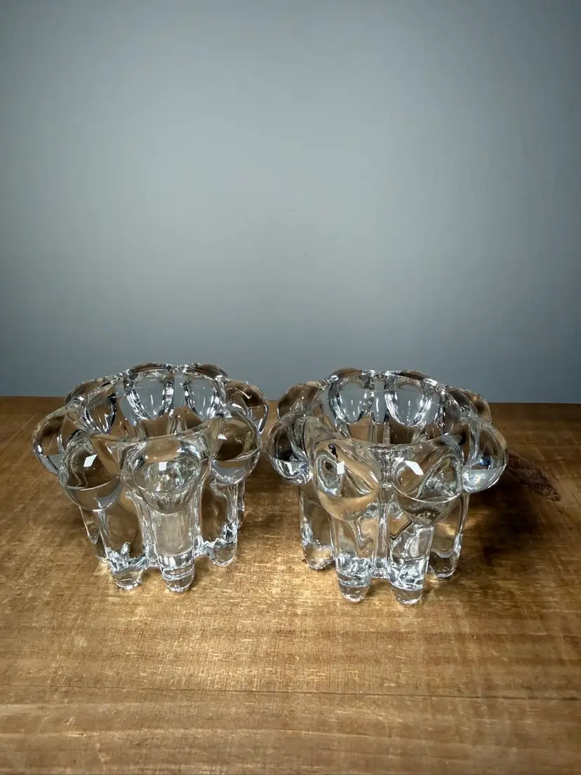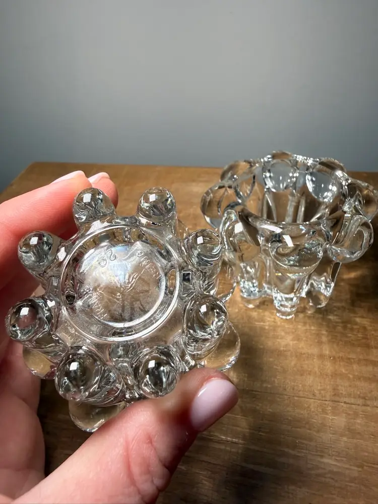 Vintage VMC Reims France glass bubble candle holders, set of 2. These heavy, clear glass holders feature a unique mid-century modern 'bubble' or 'crown' design that catches the light beautifully. Made in France and marked on the bottom.