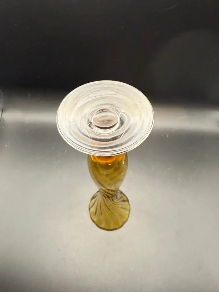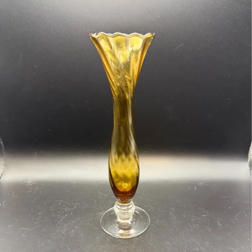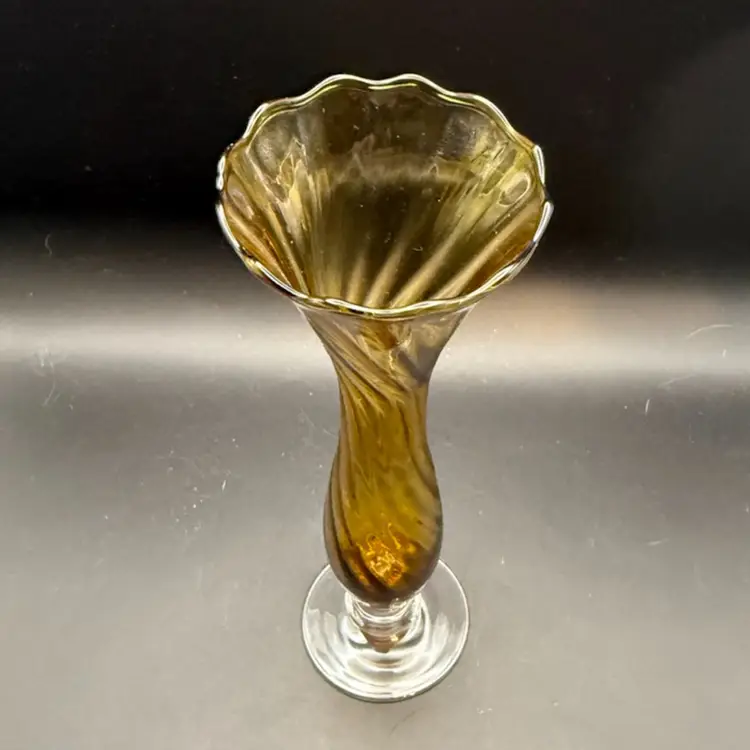 It is made of high-quality glass with a distinctive amber color for the body and a clear, swirling base. The vase features a tall, slender shape with a ruffled or fluted rim and a twisted or swirled effect in the amber glass, leading down to a clear, solid base. It stands 8 1/2 in high.