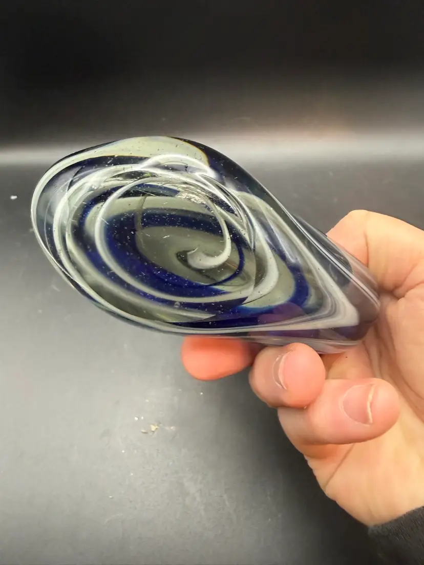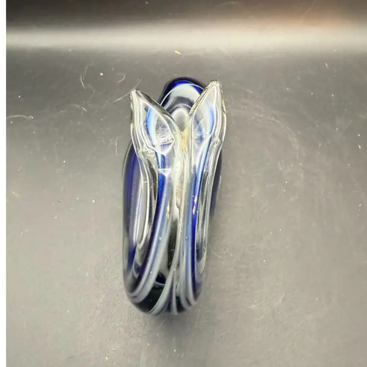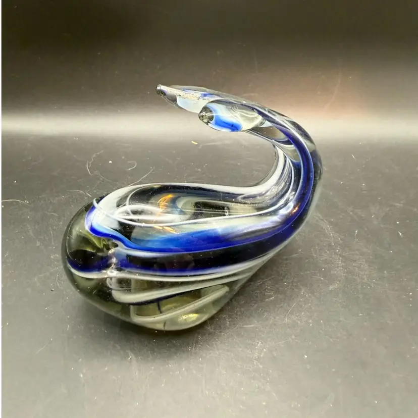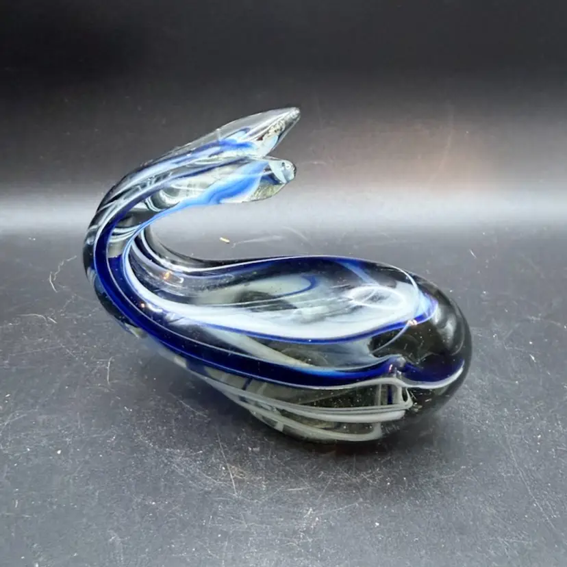 This particular whale figurine, with its swirling blue and white glass, is characteristic of the type of decorative art glass produced by various studios and independent glassblowers during the 1960s and 1970s..
