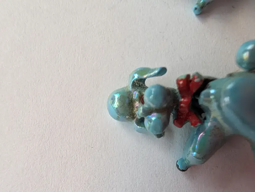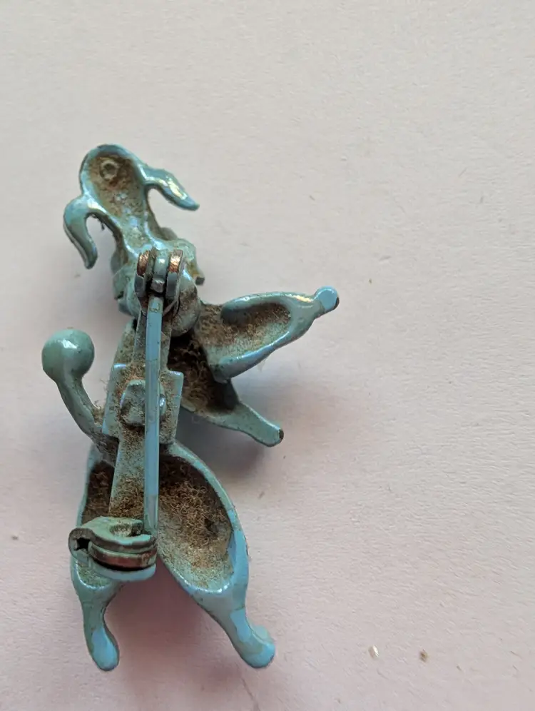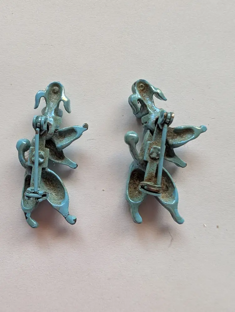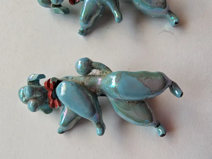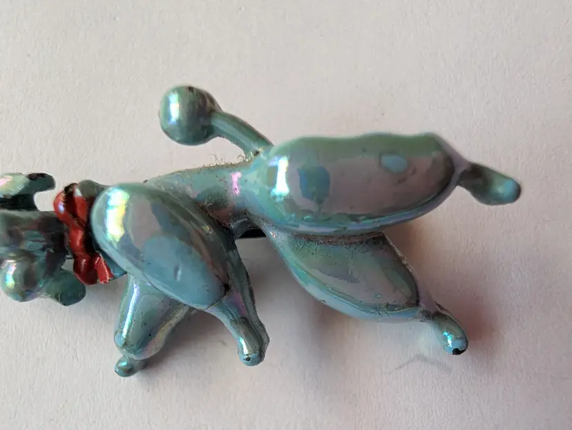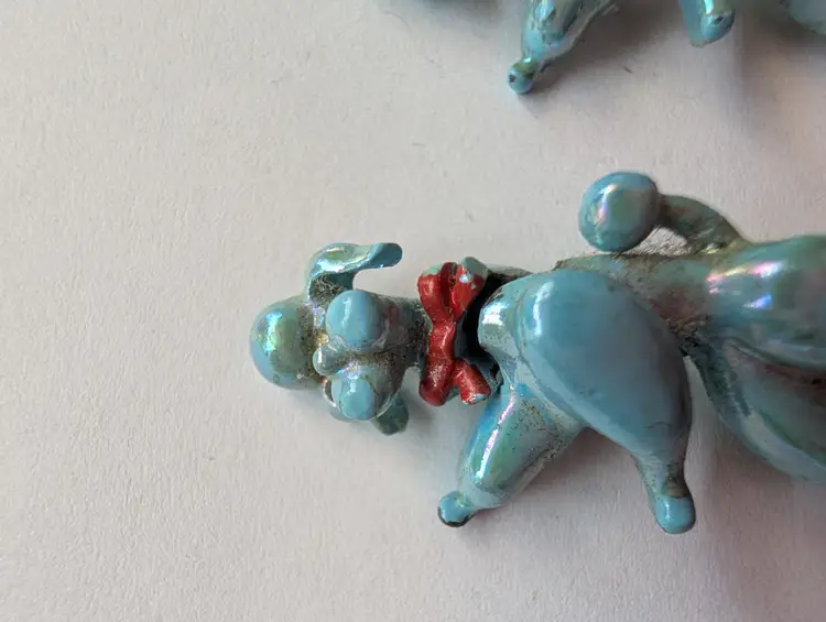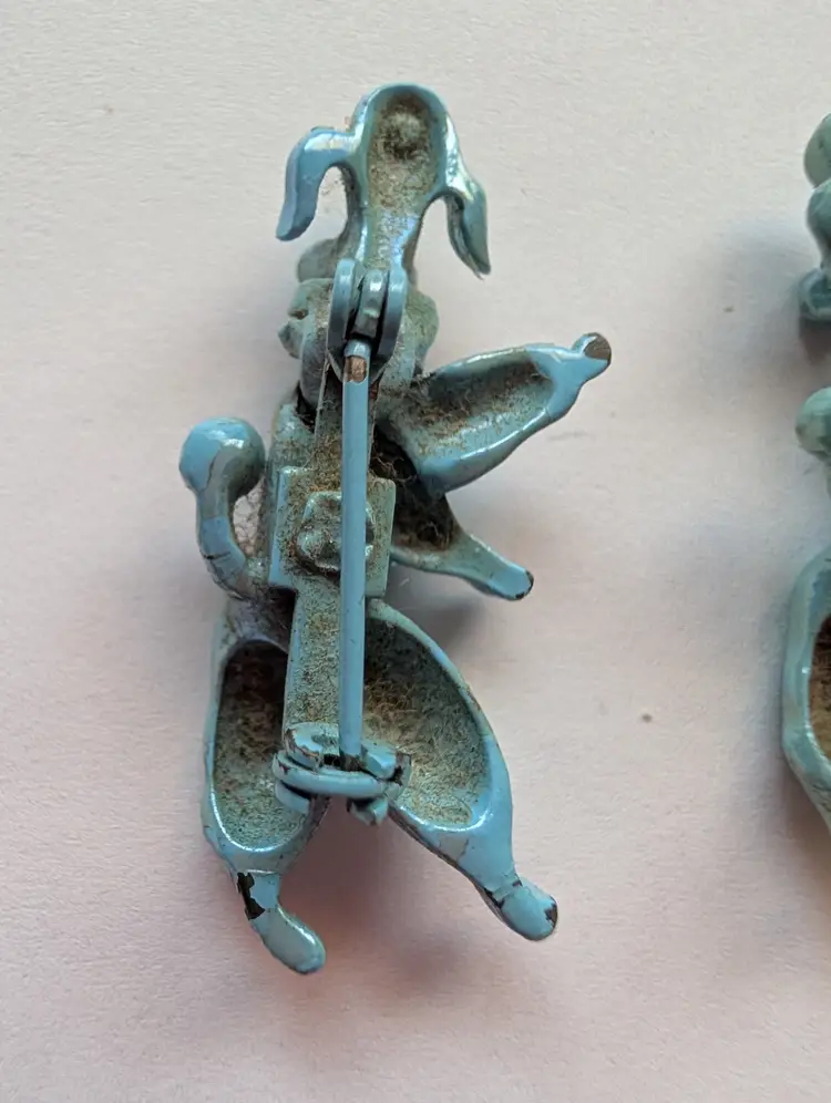 Cute Upright walking poodle pins with jointed heads and rhinestone eyes, some wear of the enamel