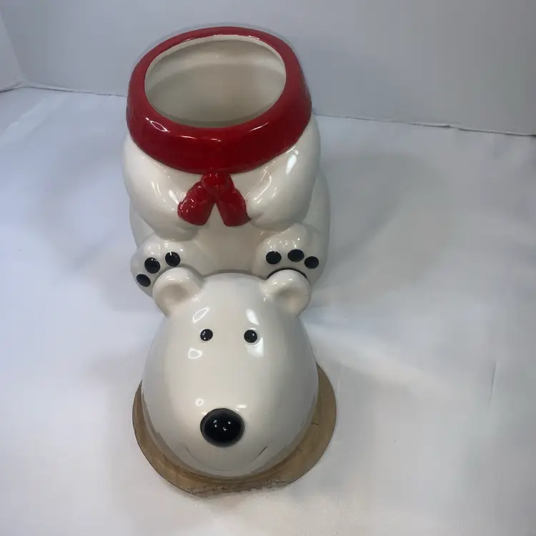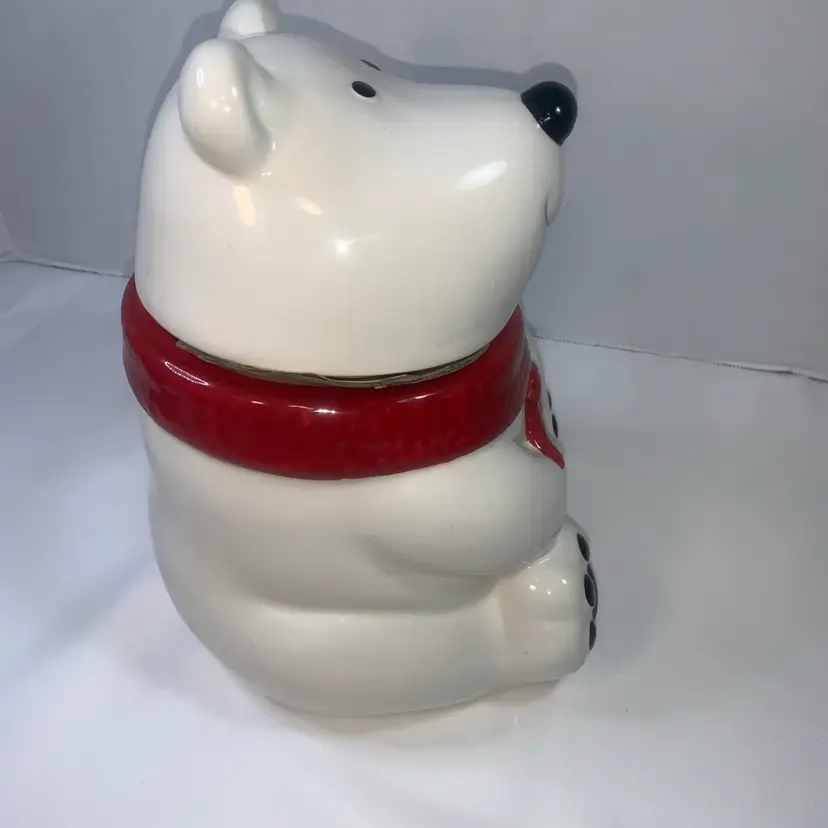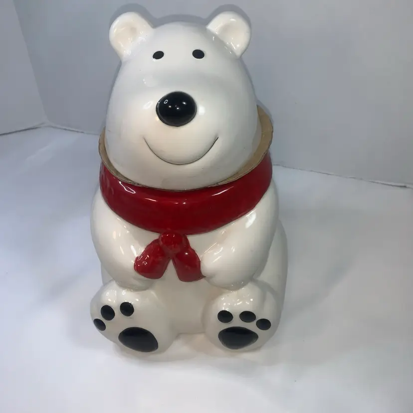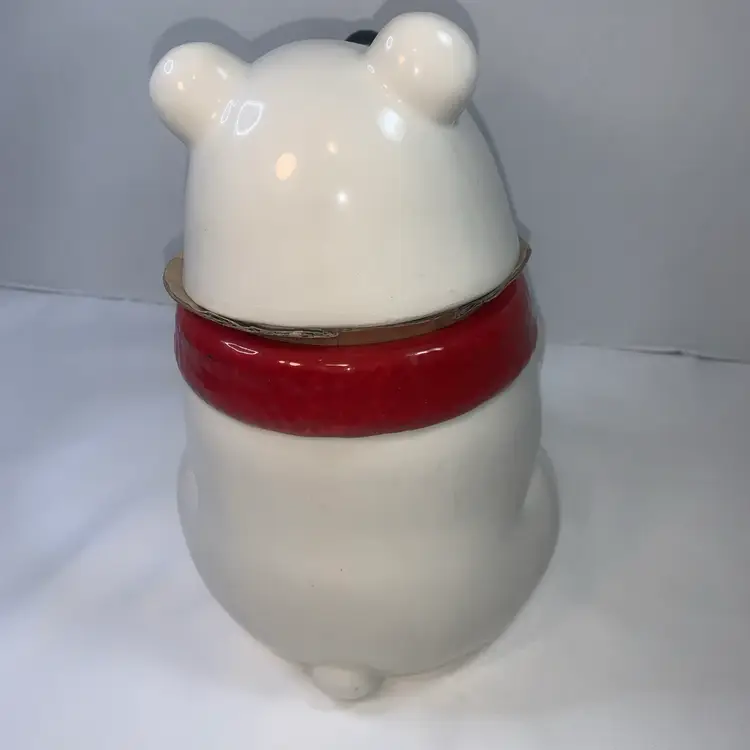 Vntg White Polar Bear Cookie Jar with red scarf no damages unbranded 9’ tall