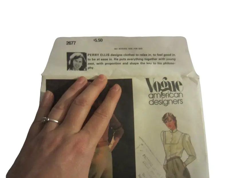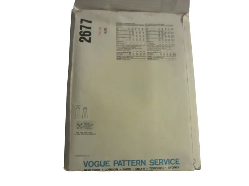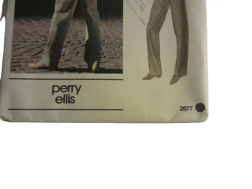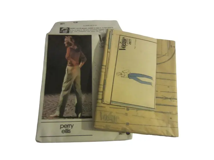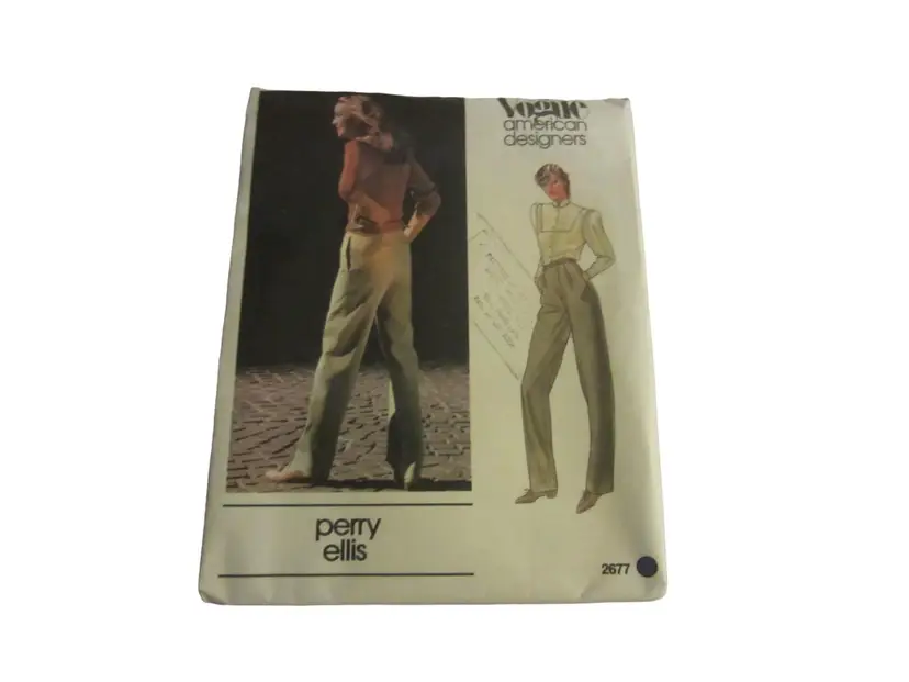 This is a vintage Vogue pattern for women's pants designed by Perry Ellis. The pattern number is 2677 and is for sizes 8-16. The pattern is in its original envelope, which is made of paper and has some wear and tear. The envelope is approximately 11 inches tall and 8 inches wide. The pattern pieces are included and are in good condition. The pattern is for a pair of high-waisted, wide-leg pants with a front pleat. The pattern includes instructions for sewing the pants. The pattern is in good condition, with no missing pieces or major damage. The pattern is a great vintage find for anyone interested in sewing or fashion history.