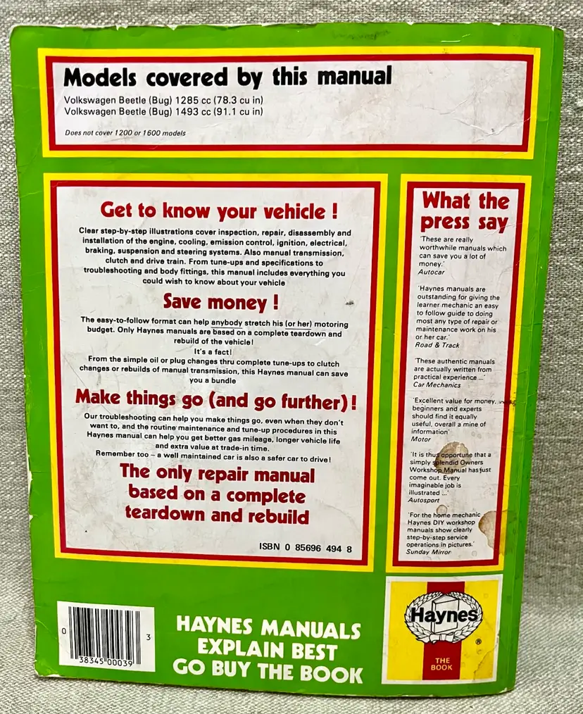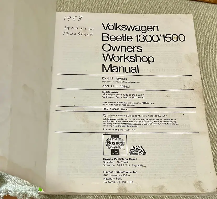 Volkswagen Beetle 1300 & 1500 Haynes Workshop Manual '65 to '70 Used Condition