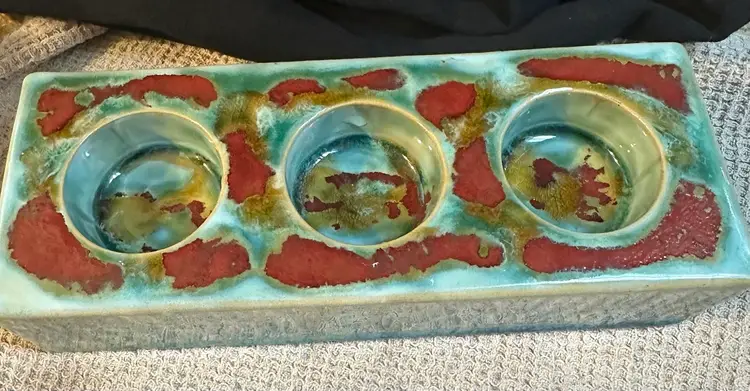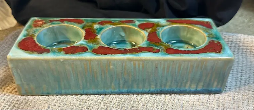 Votive Tea Light Triple Candle Holder Glazed Pottery Tan Turquoise Red . Condition is Used. Shipped with USPS Ground Advantage.
