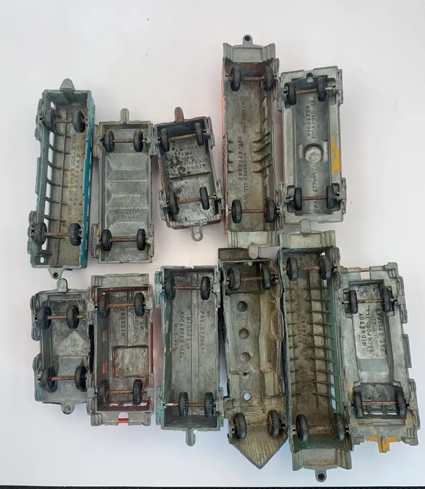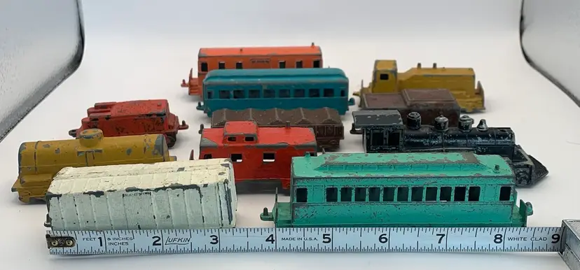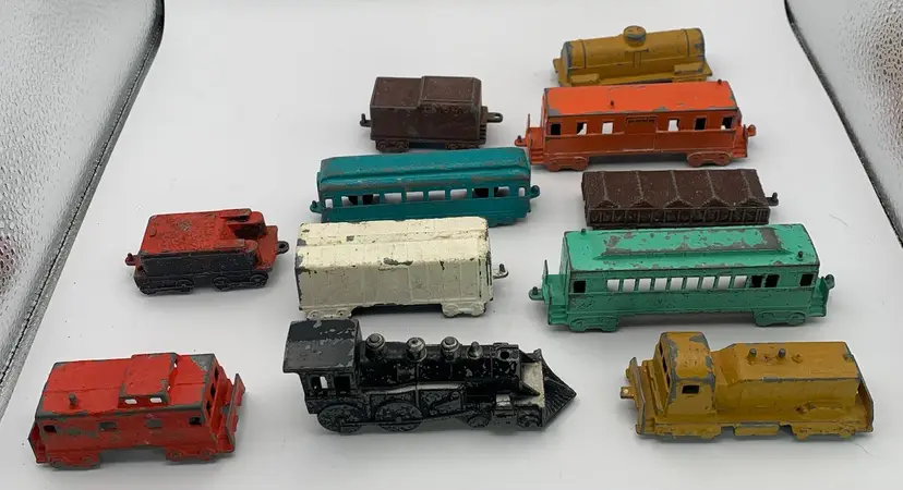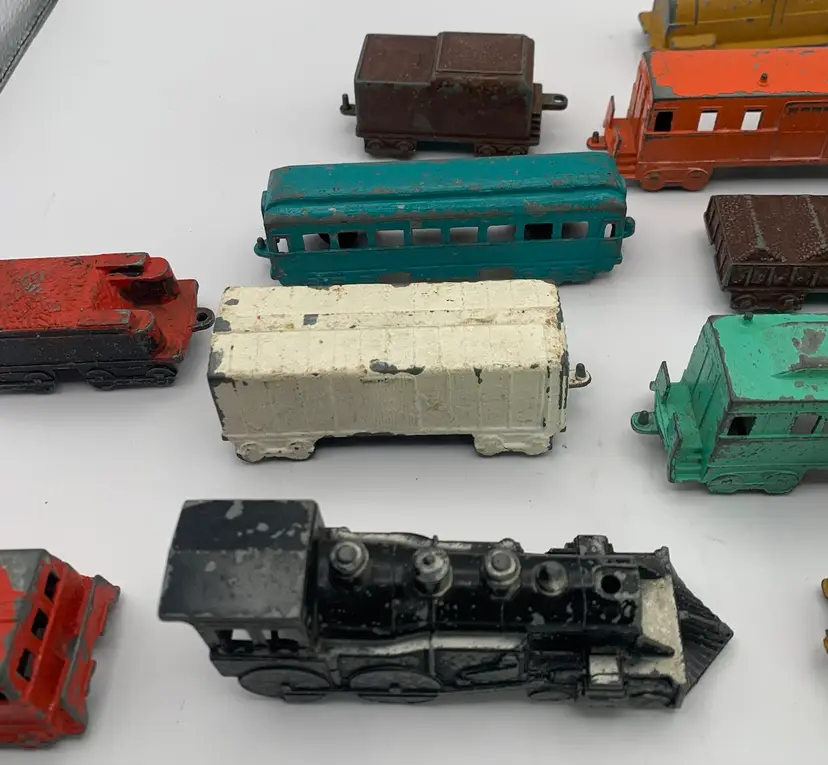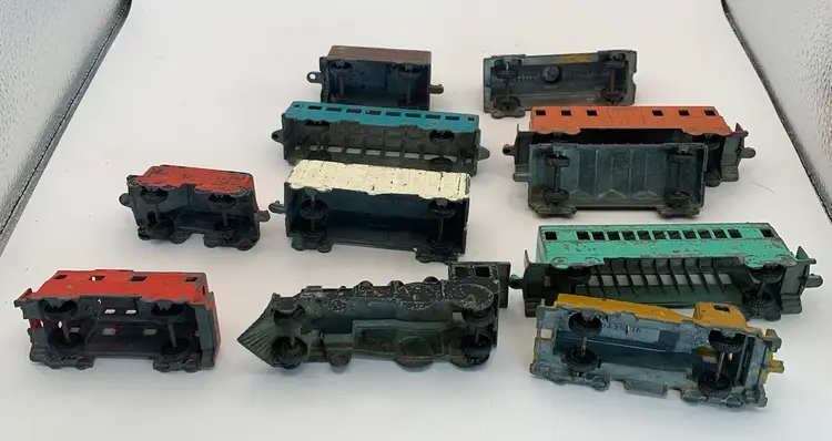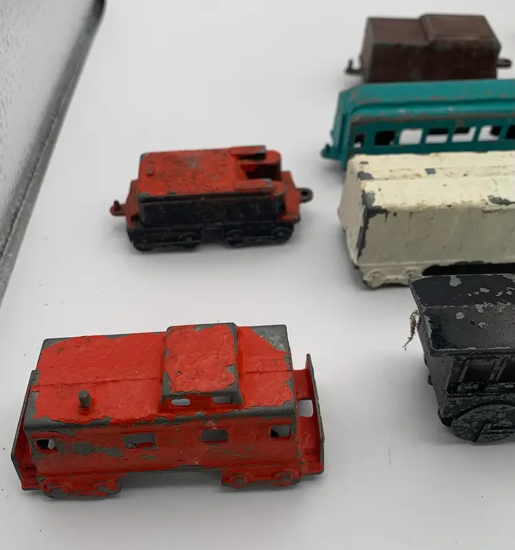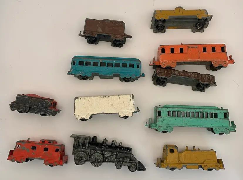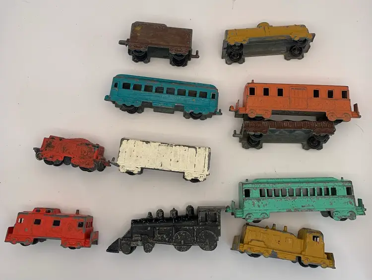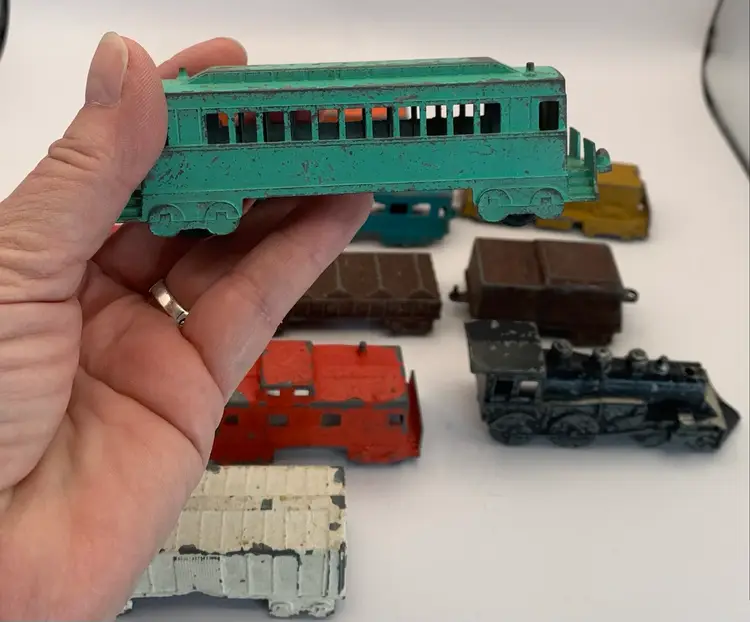 These toy trains were my brothers’ when they were little. They have been very loved and have a lot of chipped paint. I think they may have even painted some of them. Someone may like to display these.